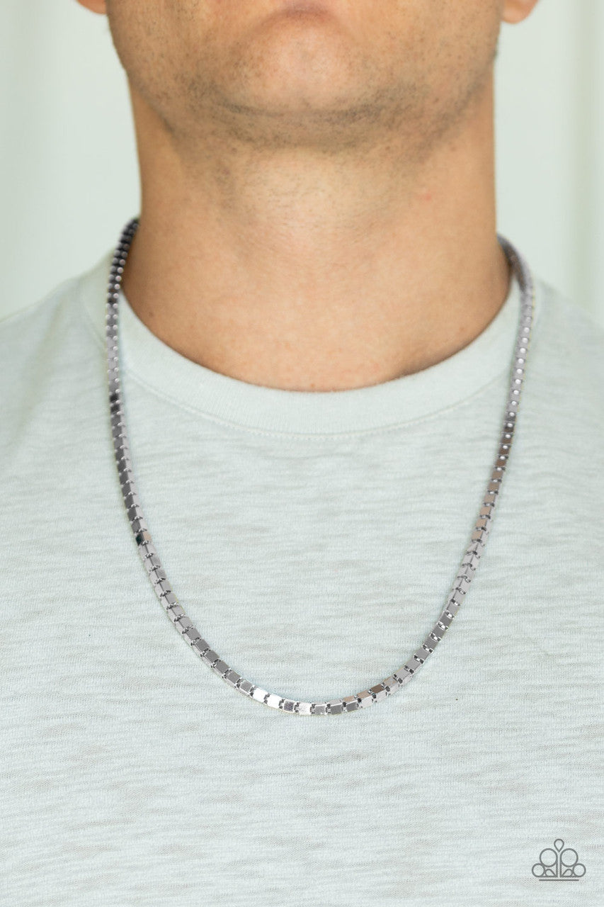 A thick strand of glistening silver box chain drapes across the chest for a bold look. Features an adjustable clasp closure.