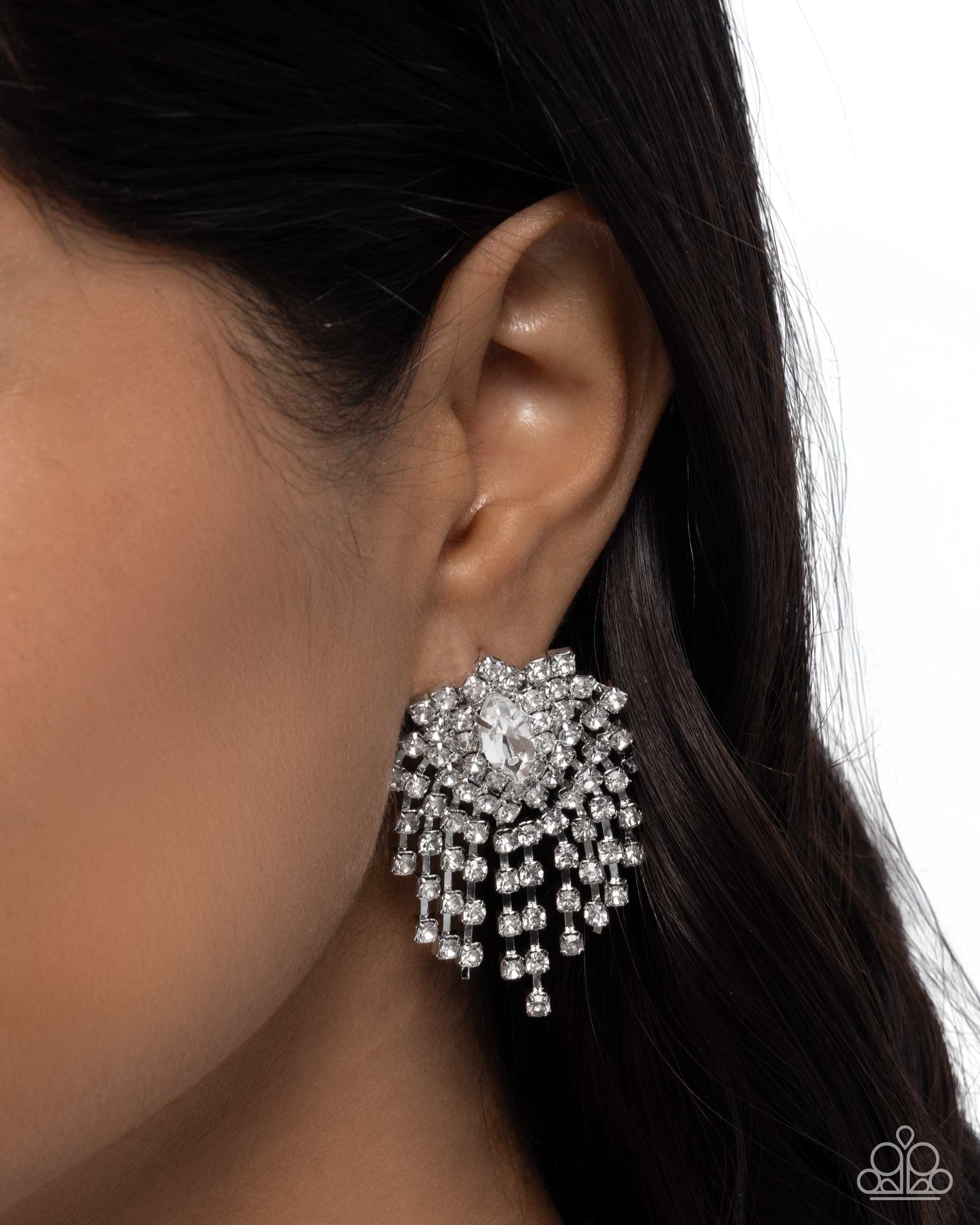 A dazzling marquise-cut rhinestone is surrounded by radiant round white rhinestones in square fittings, creating an intricate fan-like design. Cascading fringe strands of glittering rhinestones add dramatic movement and sparkle. Earring attaches to a standard post fitting.