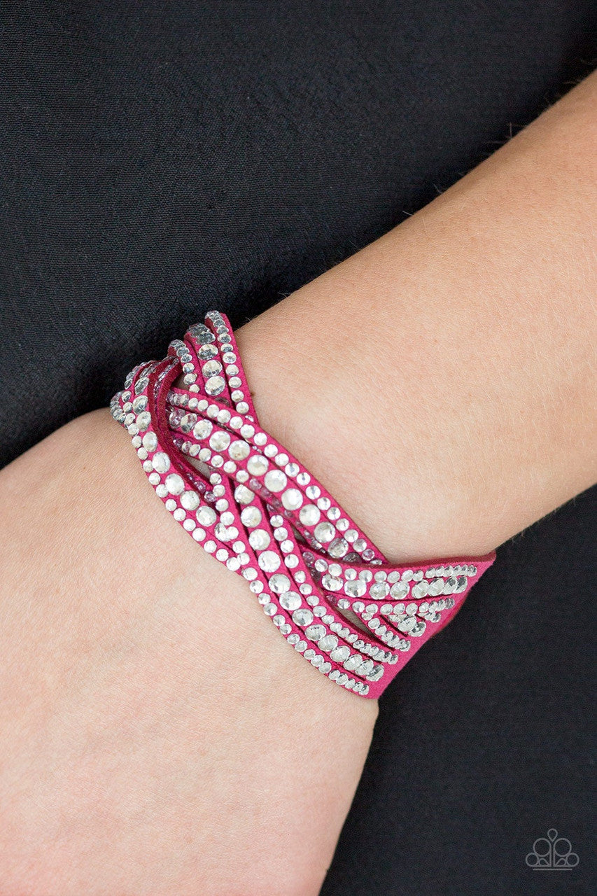 Varying in size, glassy white rhinestones are encrusted along interwoven pink suede bands, creating blinding shimmer across the wrist. Features an adjustable snap closure.