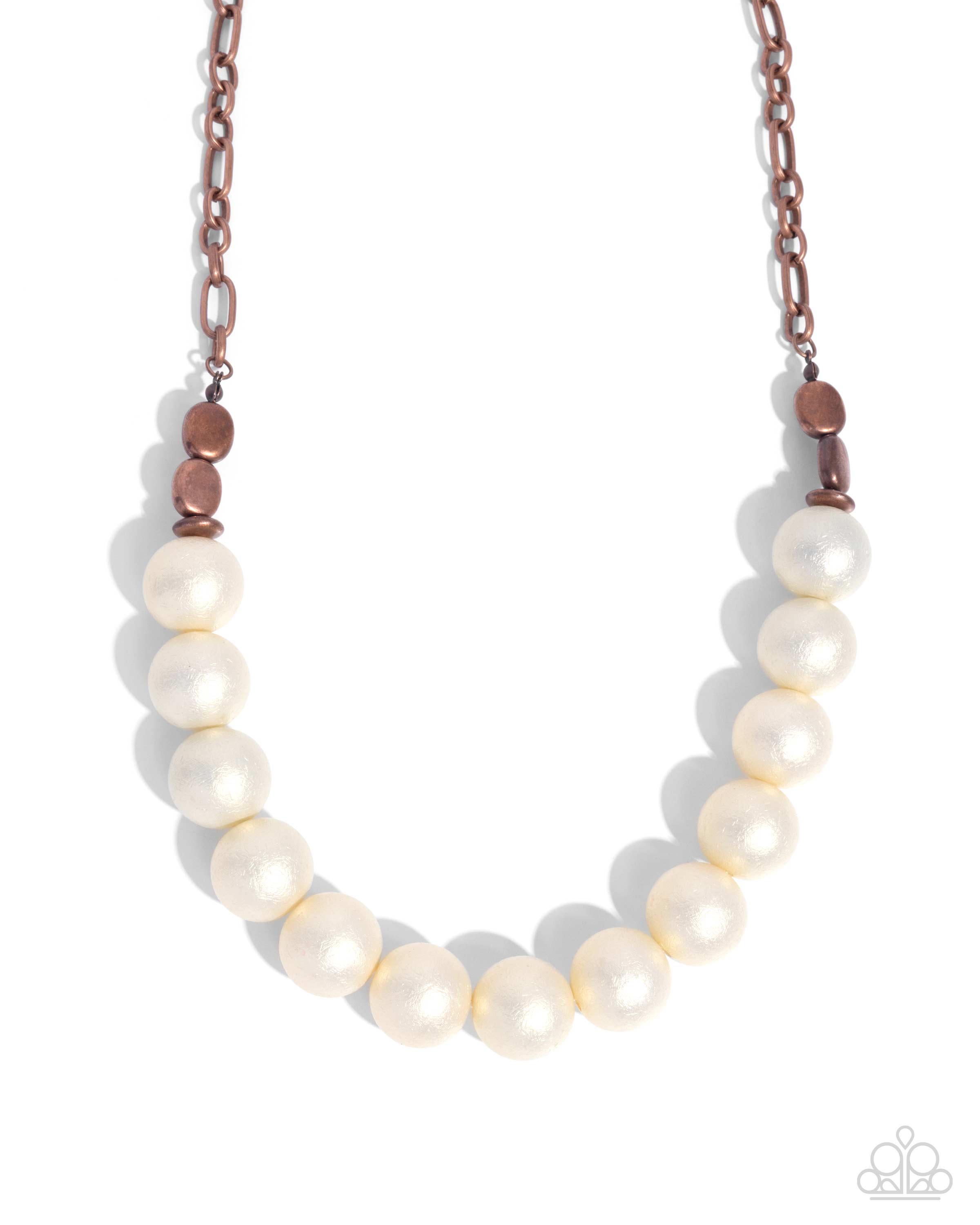 Infused along an abstract copper chain, complete with copper accents, subtly scratched white pearls layer below the collar for a timelessly textured fashion. Features an adjustable clasp closure.