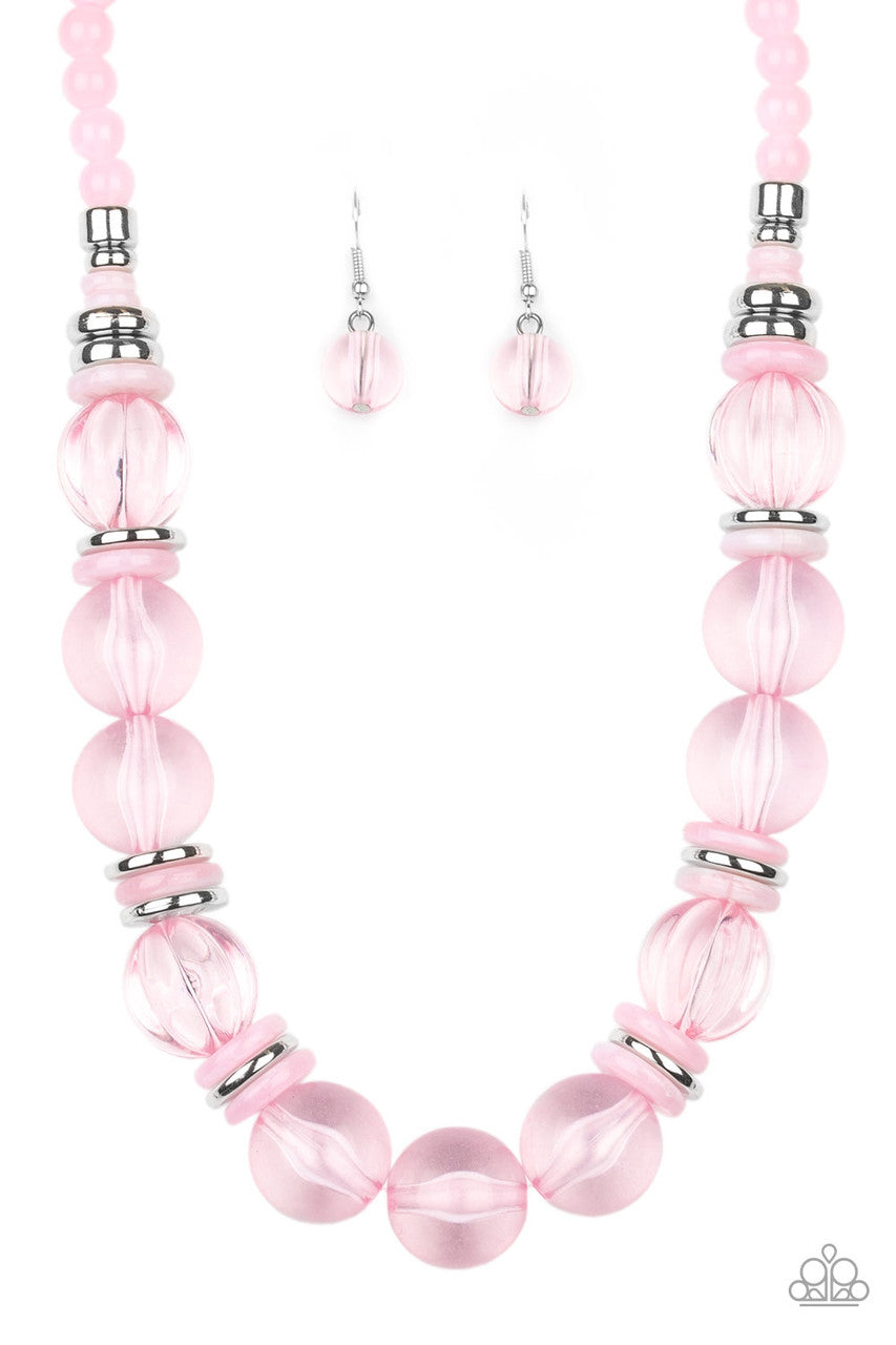 Featuring dainty silver and pink acrylic discs, a collection of oversized glassy pink beads are threaded along an invisible wire below the collar for a colorfully bubbly look. Features an adjustable clasp closure.