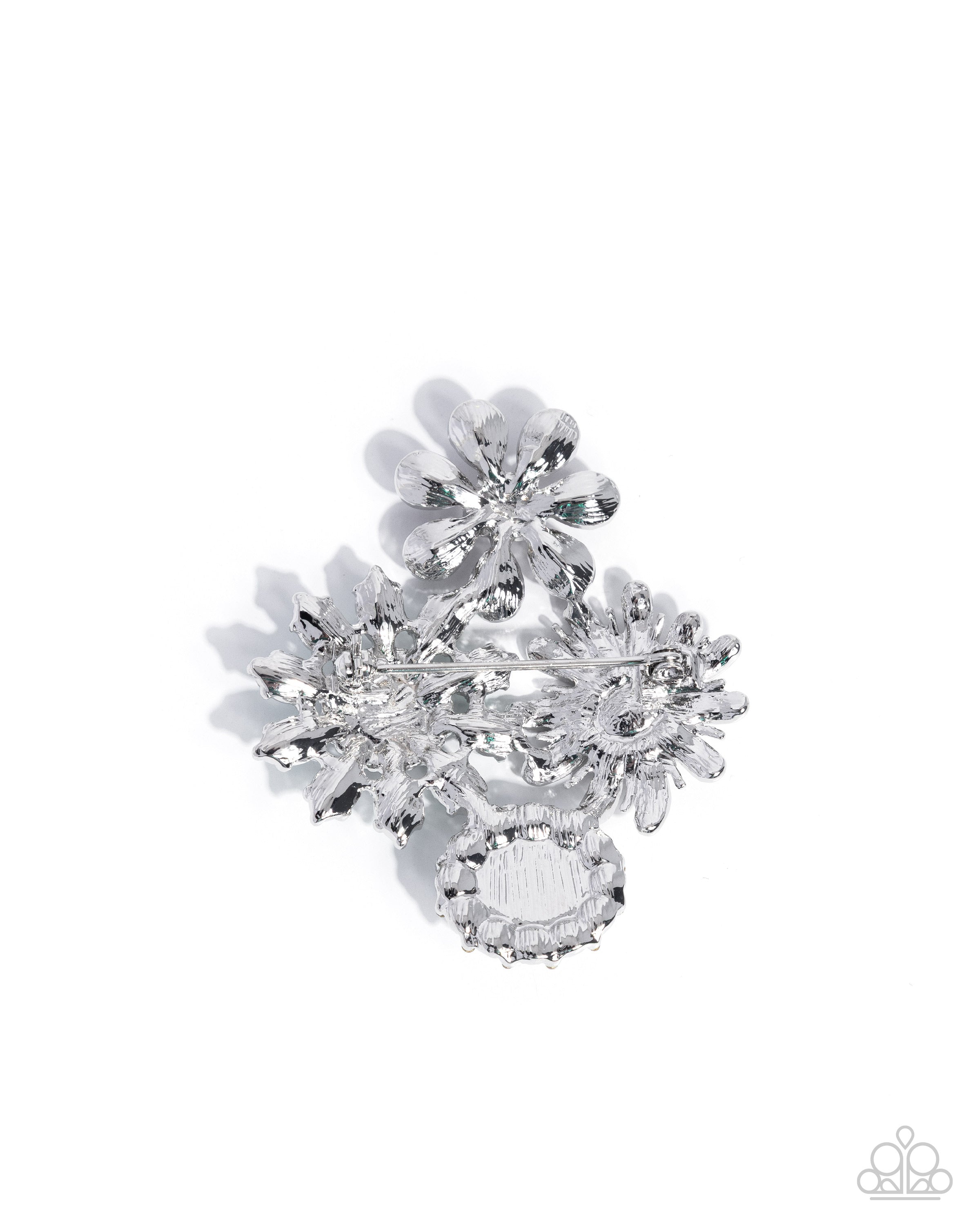 Featuring purple teardrop, smoky oval, and emerald marquise-cut gems, as well as emerald and white rhinestones, and round and oval pearls, a collection of ornately-embellished silver flowers in varying shapes coalesces into an airy bouquet for a whimsical display. Brooch measures approximately 2 1/2" in length and 2" in width.