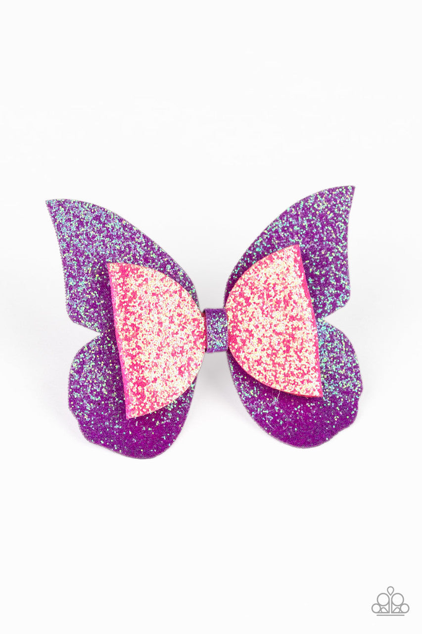 Dusted in sparkle, glittery pink and purple fabric delicately knots into a butterfly-shaped bow. Features a standard hair clip on the back.