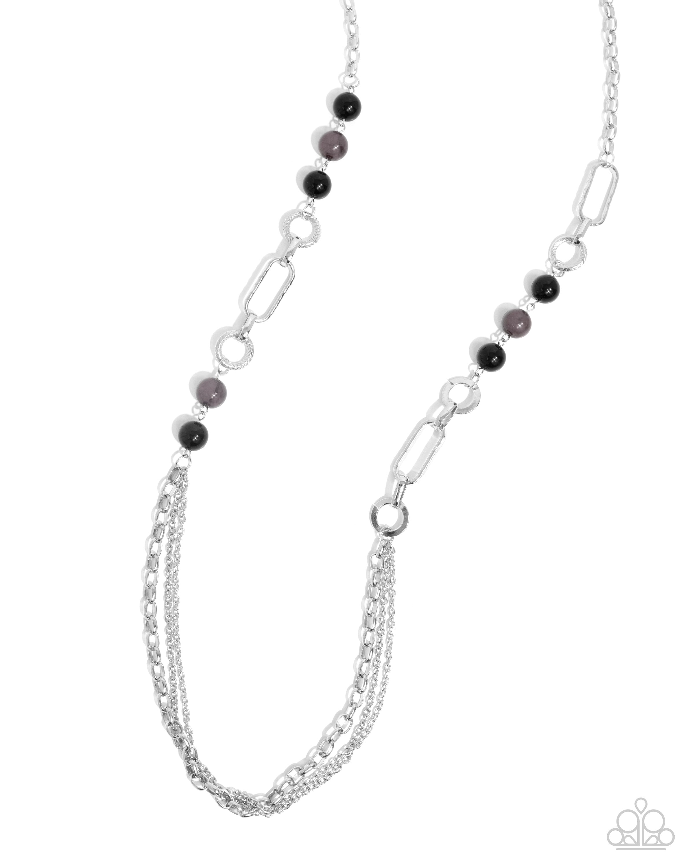 A collection of glassy and polished black beads give way to layers of mismatched silver chain for a whimsical look. Features an adjustable clasp closure.