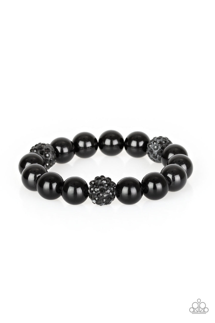 A collection of shiny black beads and black rhinestone encrusted beads are threaded along a stretchy band around the wrist for a refined flair.
