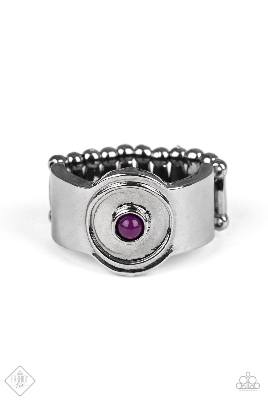 A dainty plum bead is pressed into the center of a rounded gunmetal band for a sleek minimalist look. Features a stretchy band for a flexible fit.