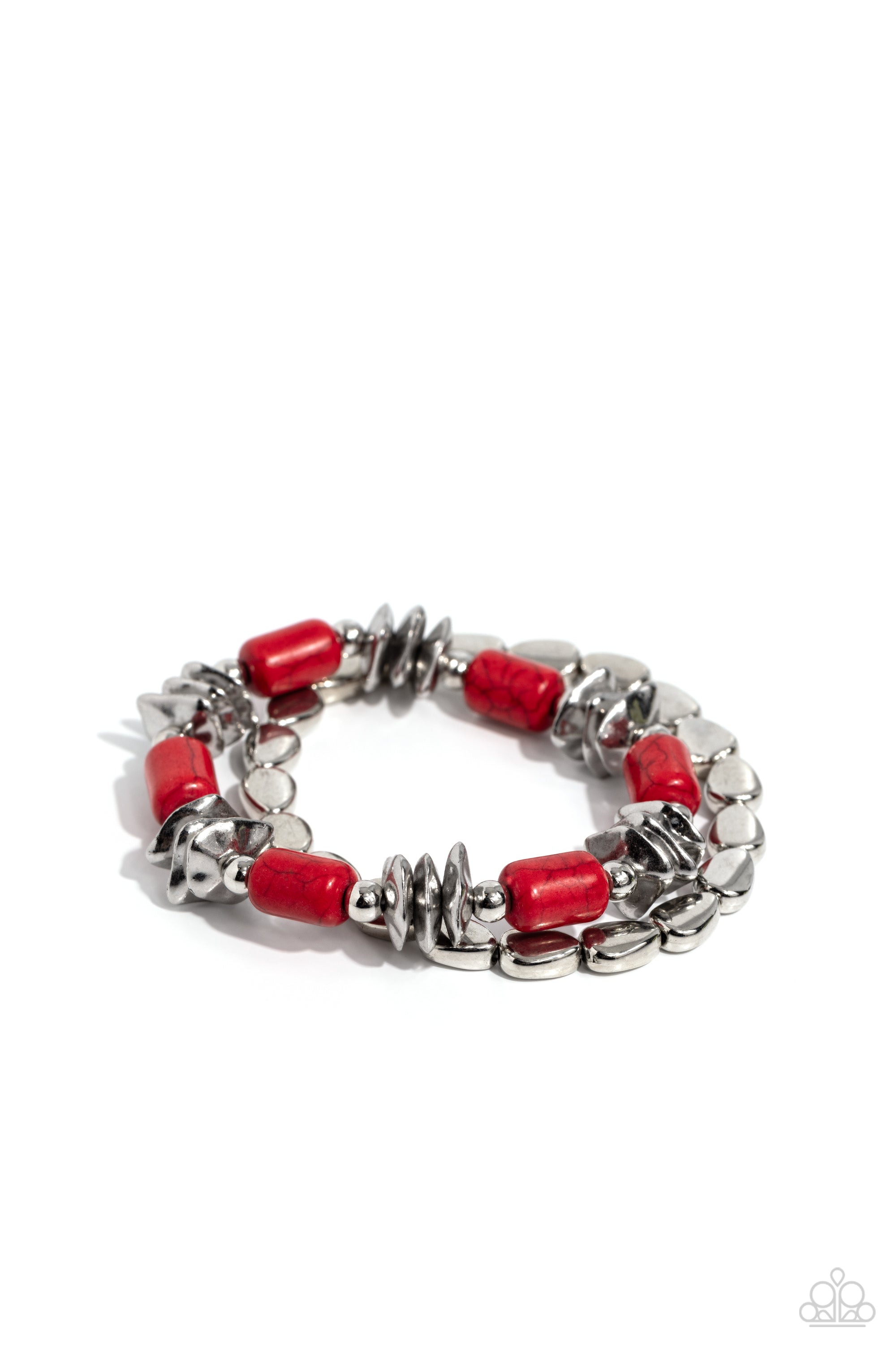 A mismatched collection of faceted silver accents, dainty silver beads, silver faux stones, and cylindrical red stones are threaded along stretchy bands around the wrist, creating an earthy pair of bracelets.