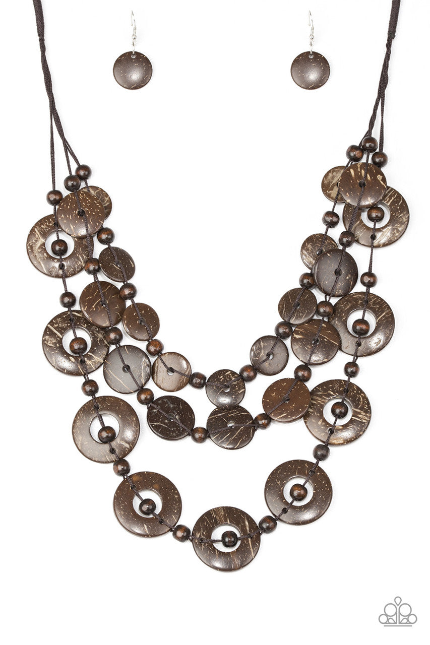 Brushed in a shell-like iridescence, brown wooden discs and round brown wooden beads are knotted along three strands of brown cording for a summery look. Features a button loop closure.