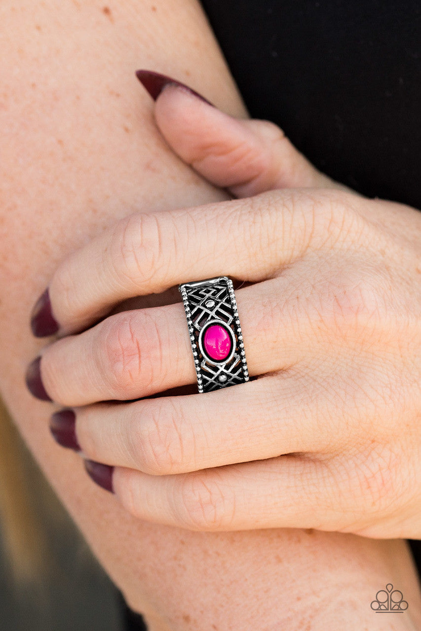 A vivacious pink bead is pressed into the center of a silver band radiating with tribal inspired textures for a seasonal look. Features a stretchy band for a flexible fit.