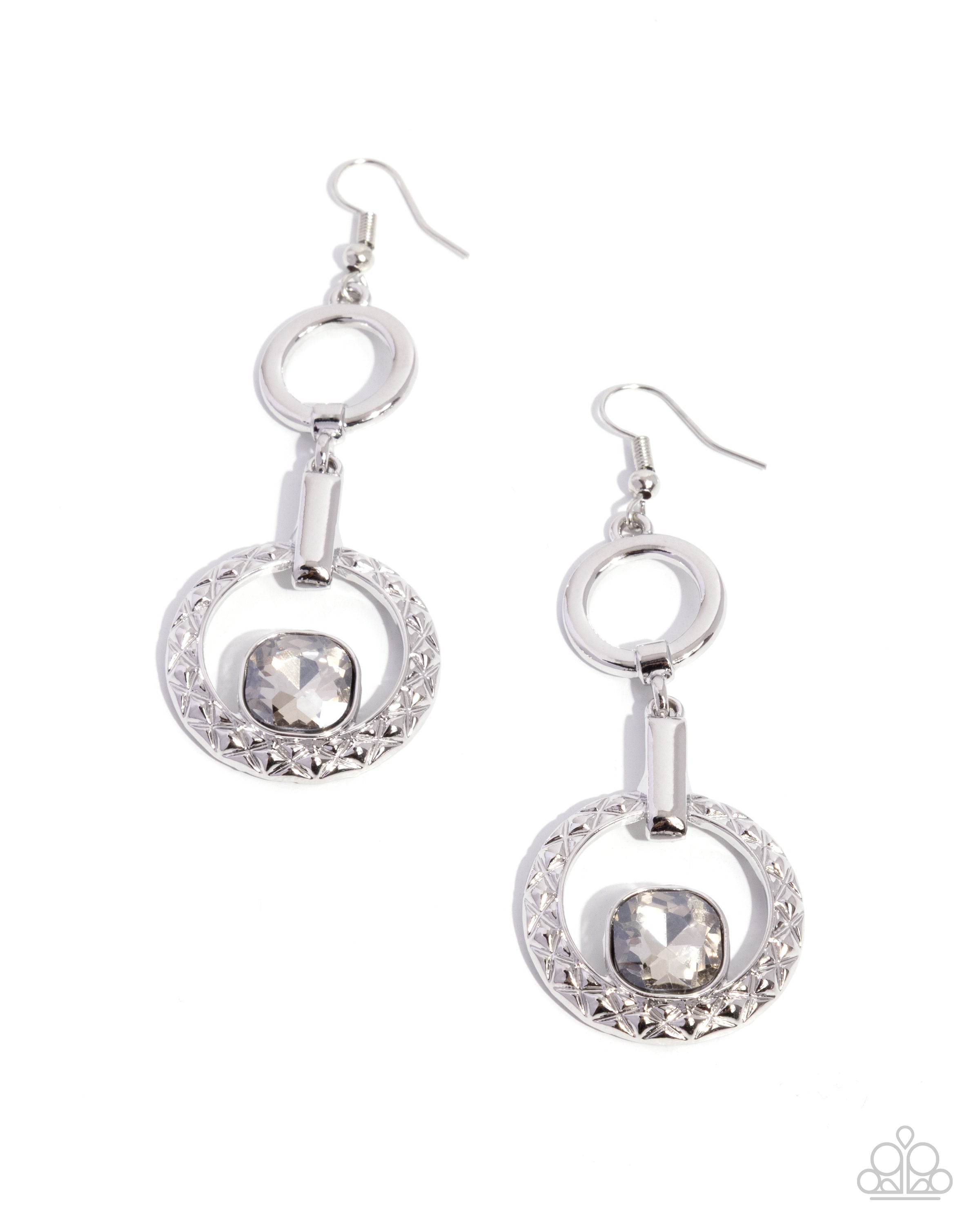 A faceted, asscher-cut smoky gem is pressed into a silver frame that is perched along the bottom of an ornately, diamond-cut textured silver hoop, that sways from an attached silver fitting that gives way from a simple silver hoop, resulting in a regal pop of color. Earring attaches to a standard fishhook fitting.