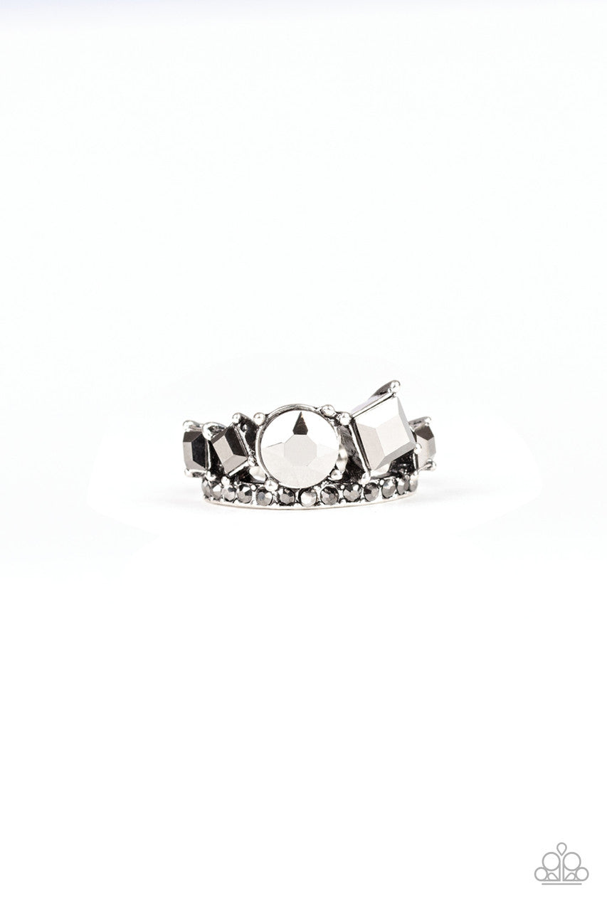 A collection of round and square hematite rhinestones coalesce atop a silver band encrusted in dainty hematite rhinestones for a dramatic look. Features a dainty stretchy band for a flexible fit.