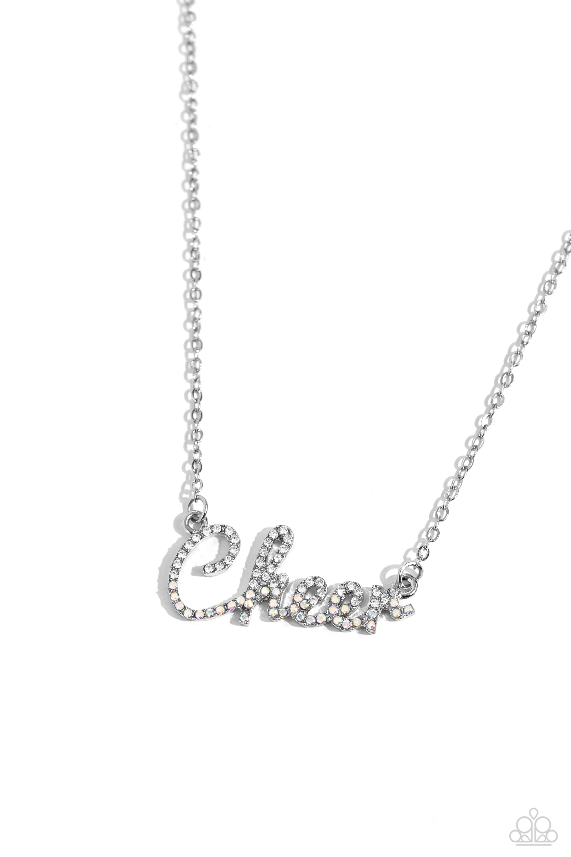 Curled in a script font, glistening silver letters spell out the word "Cheer" along a dainty silver chain. Embossed on the letters, dainty white rhinestones and iridescent rhinestones create a subtle ombrŽ effect for a peppy finish. Features an adjustable clasp closure. Due to its prismatic palette, color may vary.