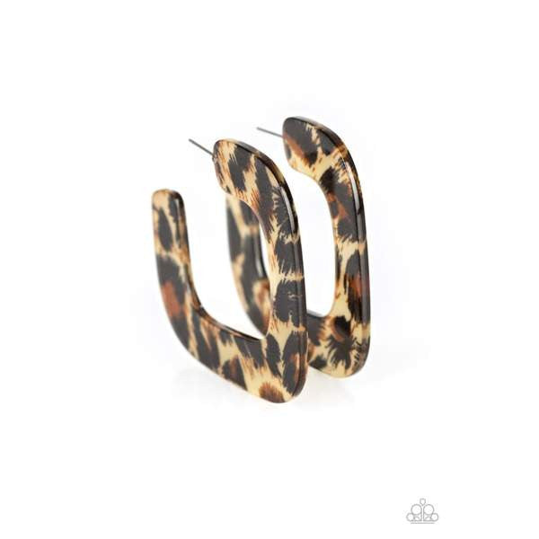 Featuring a cheetah-like print, a glassy frame folds into an angular hoop for a retro style. Earring attaches to a standard post fitting. Hoop measures 2 1/2" in diameter.
