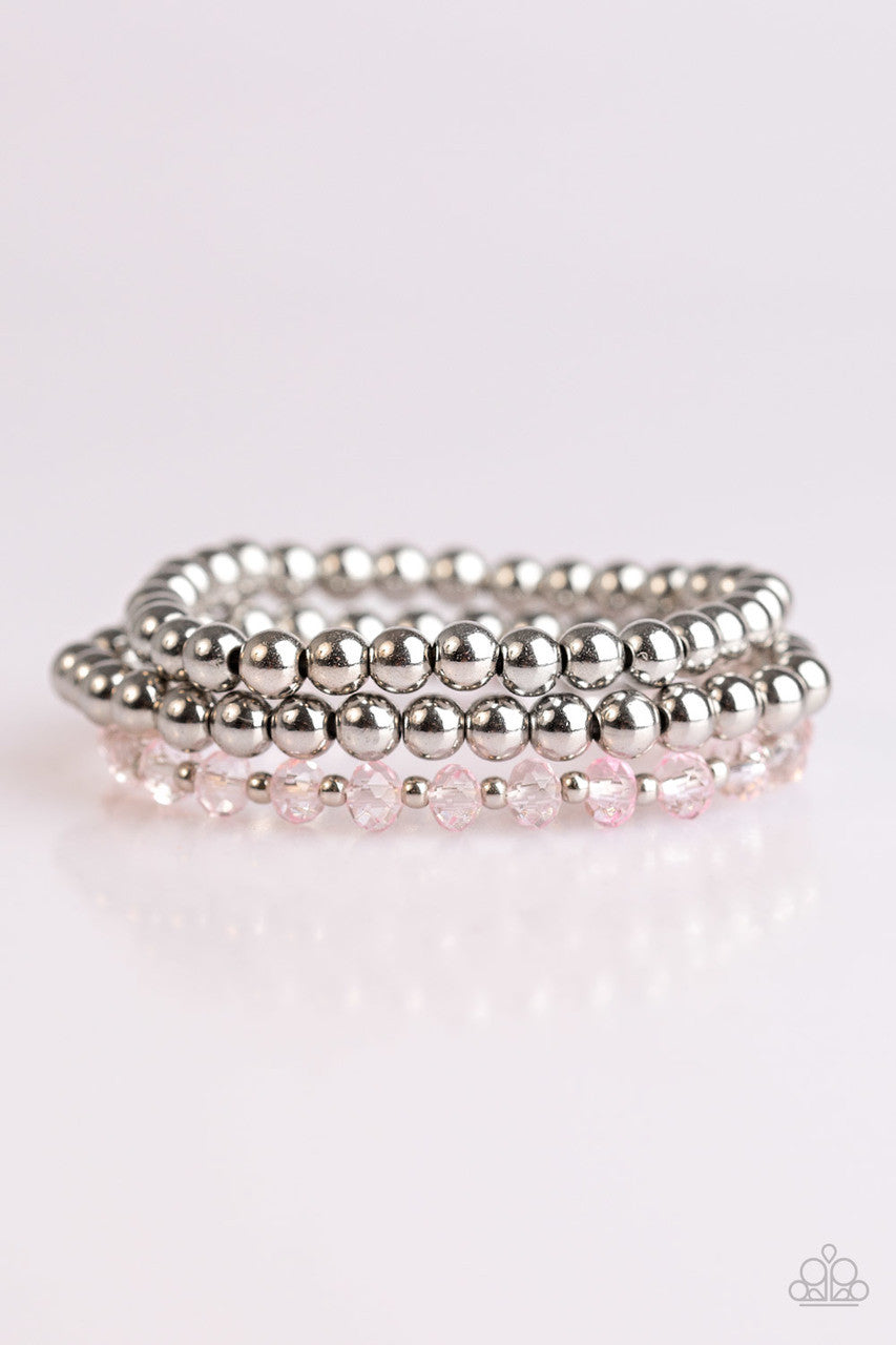 Classic silver beads and faceted pink beading are threaded along three stretchy bands, creating refined layers across the wrist in a sleek fashion.