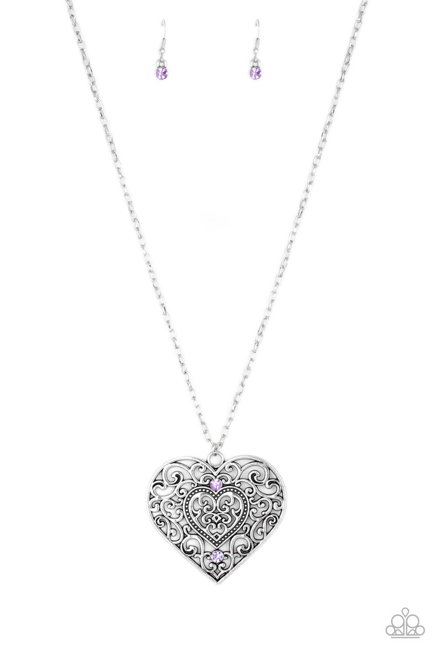 Dotted with glittery purple rhinestones, an oversized heart frame radiating with glistening filigree detail swings from the bottom of a lengthened silver chain for a vintage inspired look. Features an adjustable clasp closure.