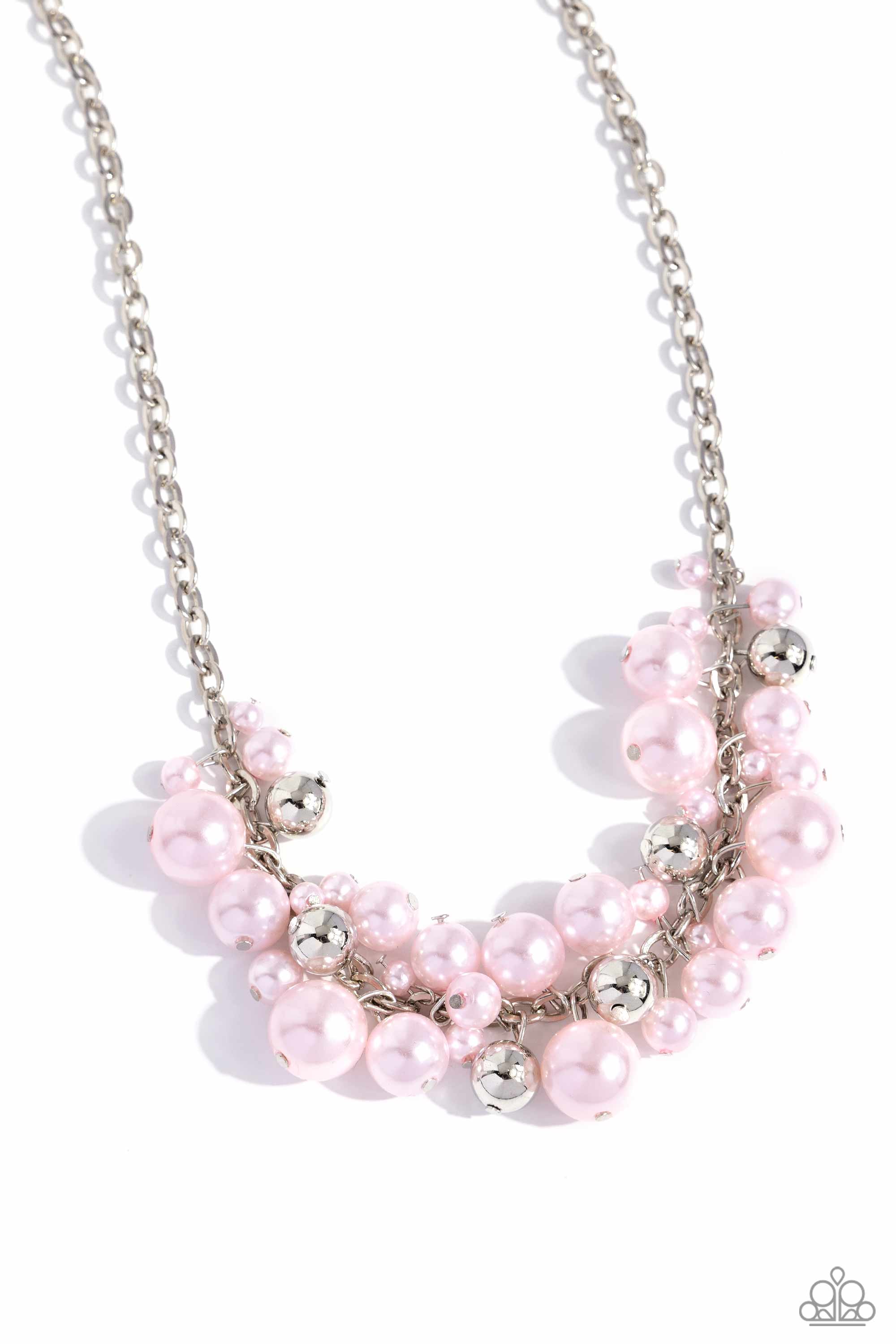 An effervescent collection of bubbly pink pearls and shiny silver beads delicately cluster along the center of an ornate silver chain, creating a classic fringe below the collar. Features an adjustable clasp closure.