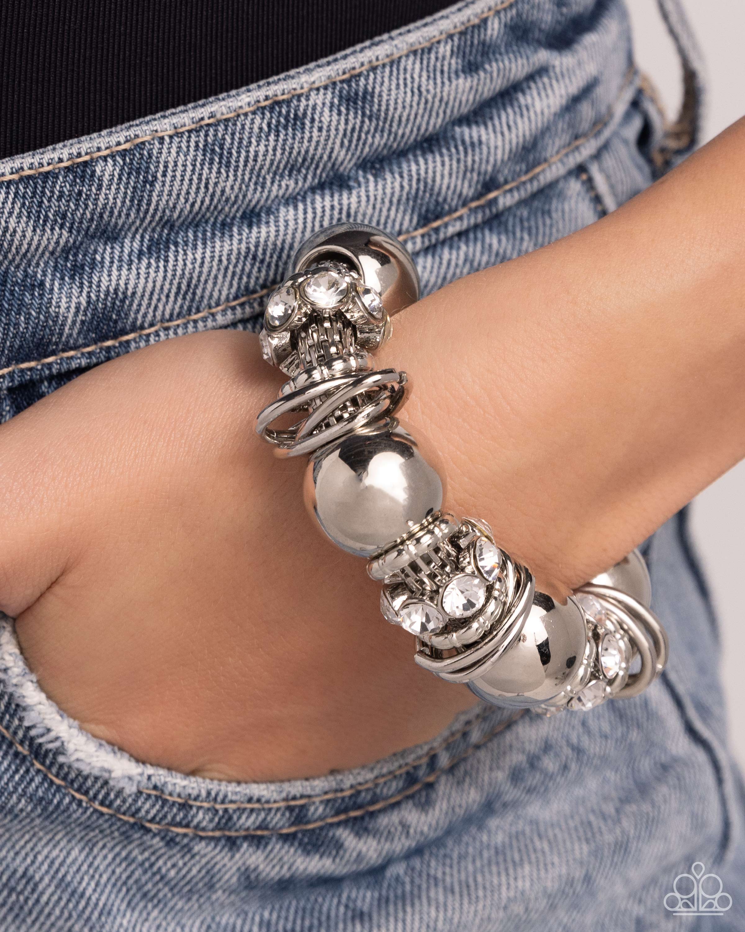 Infused along an industrial abstract stretchy chain, a collection of interlocking silver rings, oversized silver beads, and white gem-encrusted silver accents twists and coils along the wrist for a charismatically confident look.