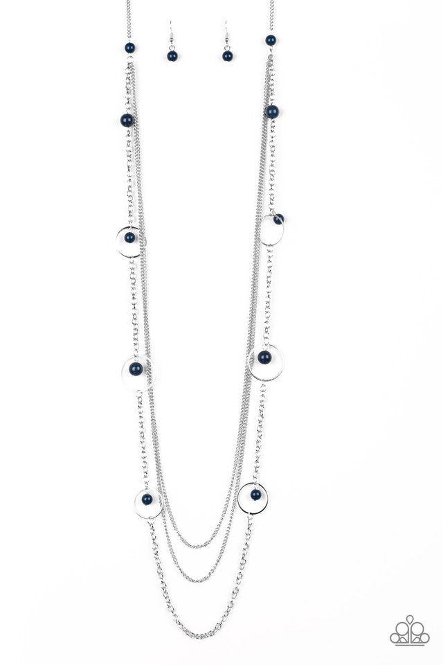 Infused with two plain strands of shimmery silver chains, polished blue beads and shimmery silver hoops trickle along a bold silver chain for a whimsically layered look. Features an adjustable clasp closure. Sold as one individual necklace. Includes one pair of matching earrings.