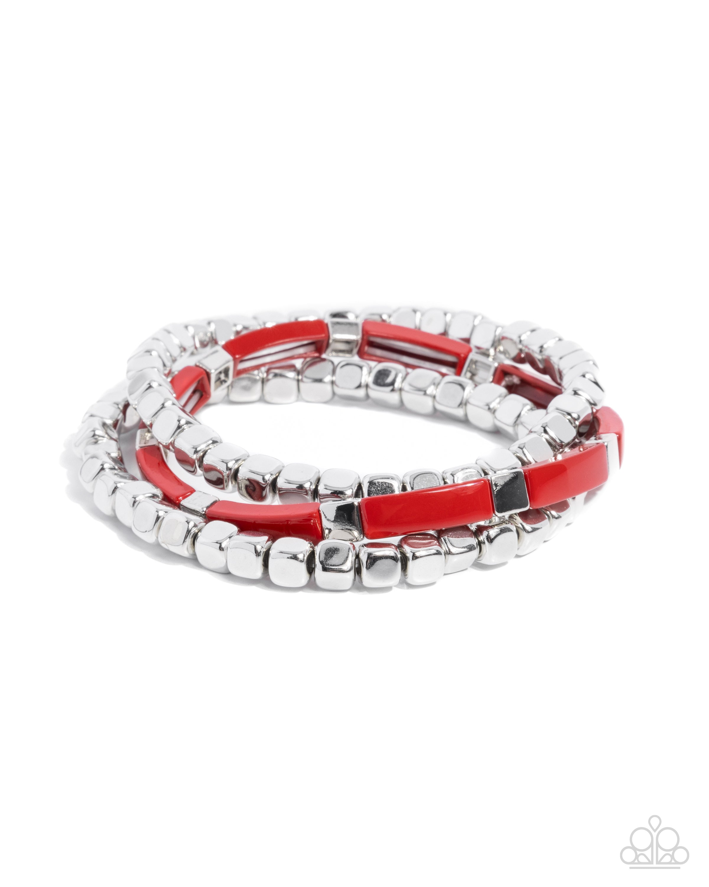 Infused along elastic stretchy bands, a collection of cubed silver beads and red-painted frames shimmer and stack along the wrist for a colorfully chic look.