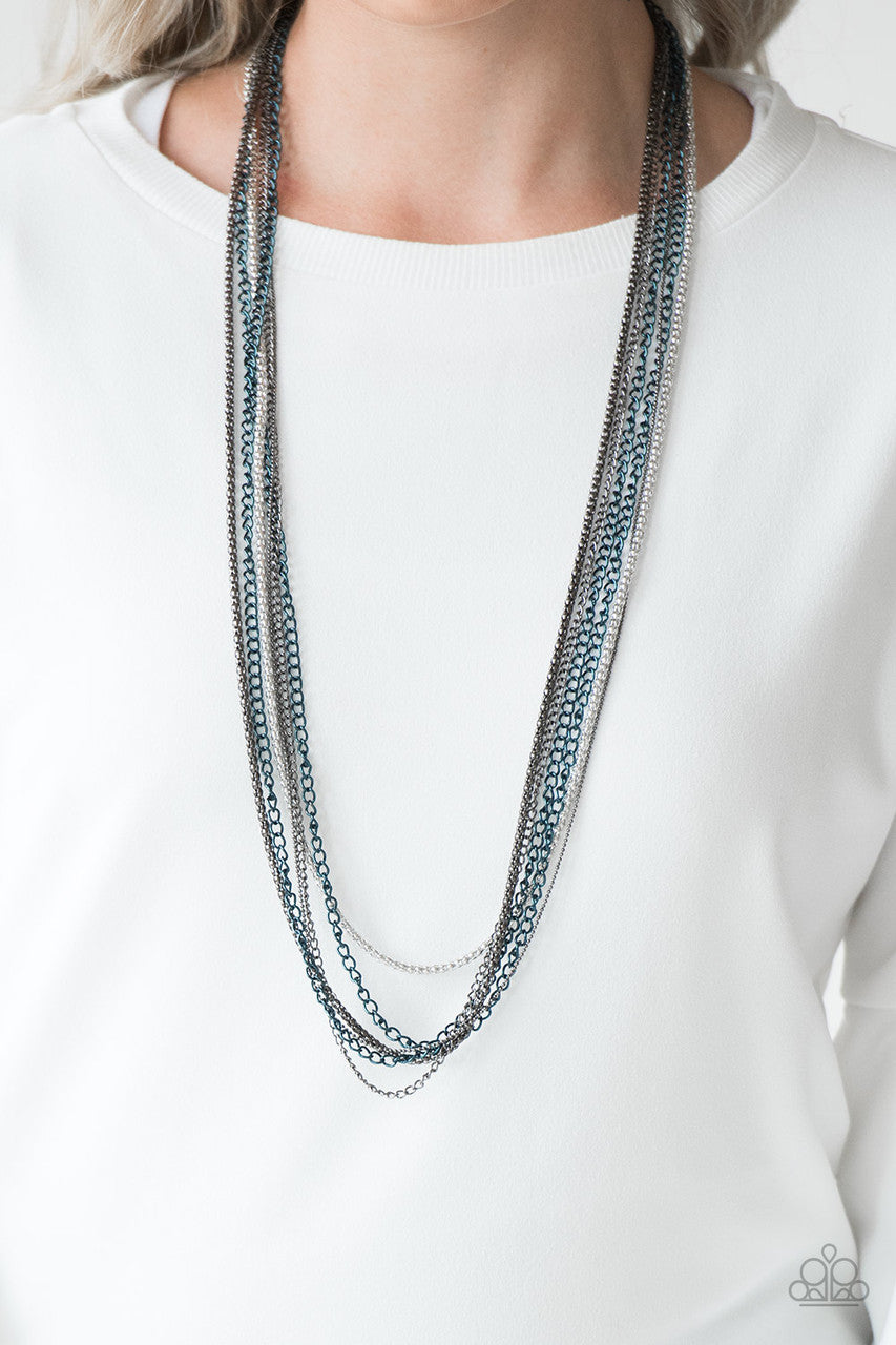 Brushed in a metallic finish, blue chains collide with mismatched gunmetal and silver chains across the chest. Shimmery silver and gunmetal popcorn chains join the colorful layers, adding shimmery metallic texture to the spunky mixed palette. Features an adjustable clasp closure.