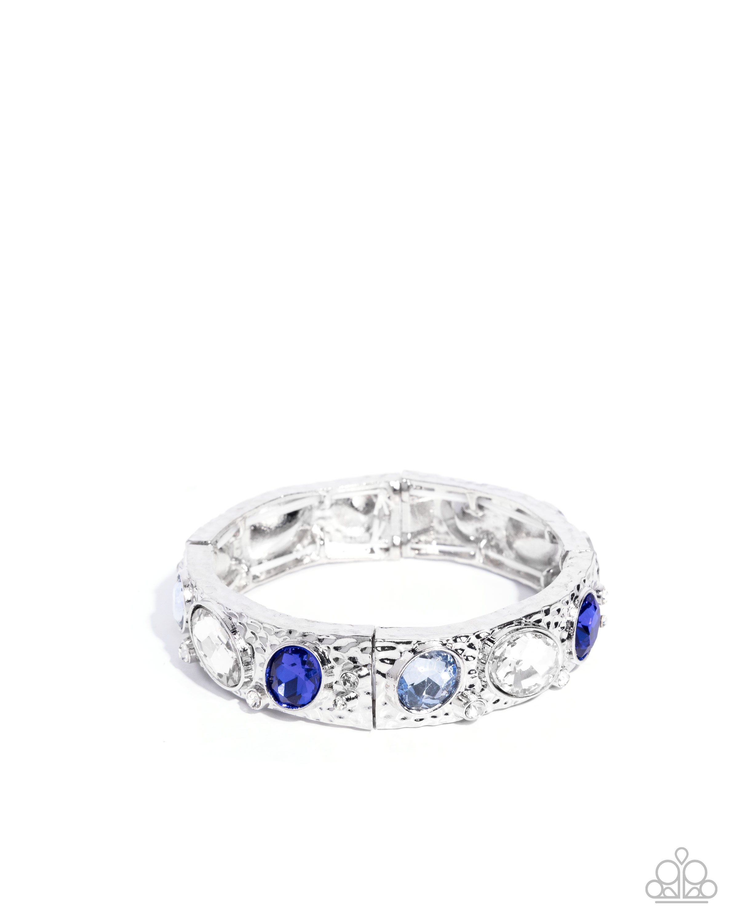 Infused along elastic stretchy bands, a collection of blue and white multicolored oval gems, centered within silver square hammered frames tilted in varying directions, wrap around the wrist for a colorfully refined display.