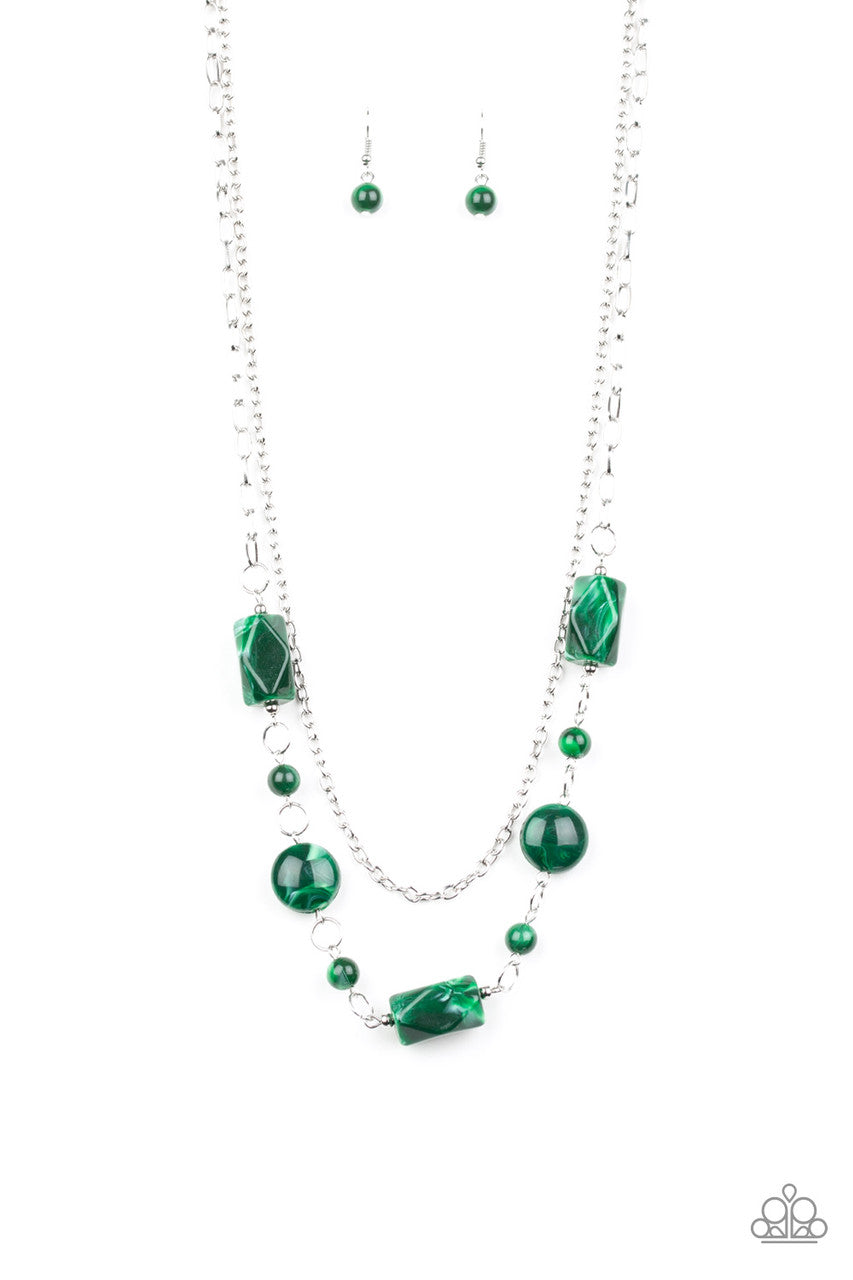 Infused with a plain silver chain, a collection of round and faceted green acrylic beads link below the collar for a whimsically colorful finish. Features an adjustable clasp closure.