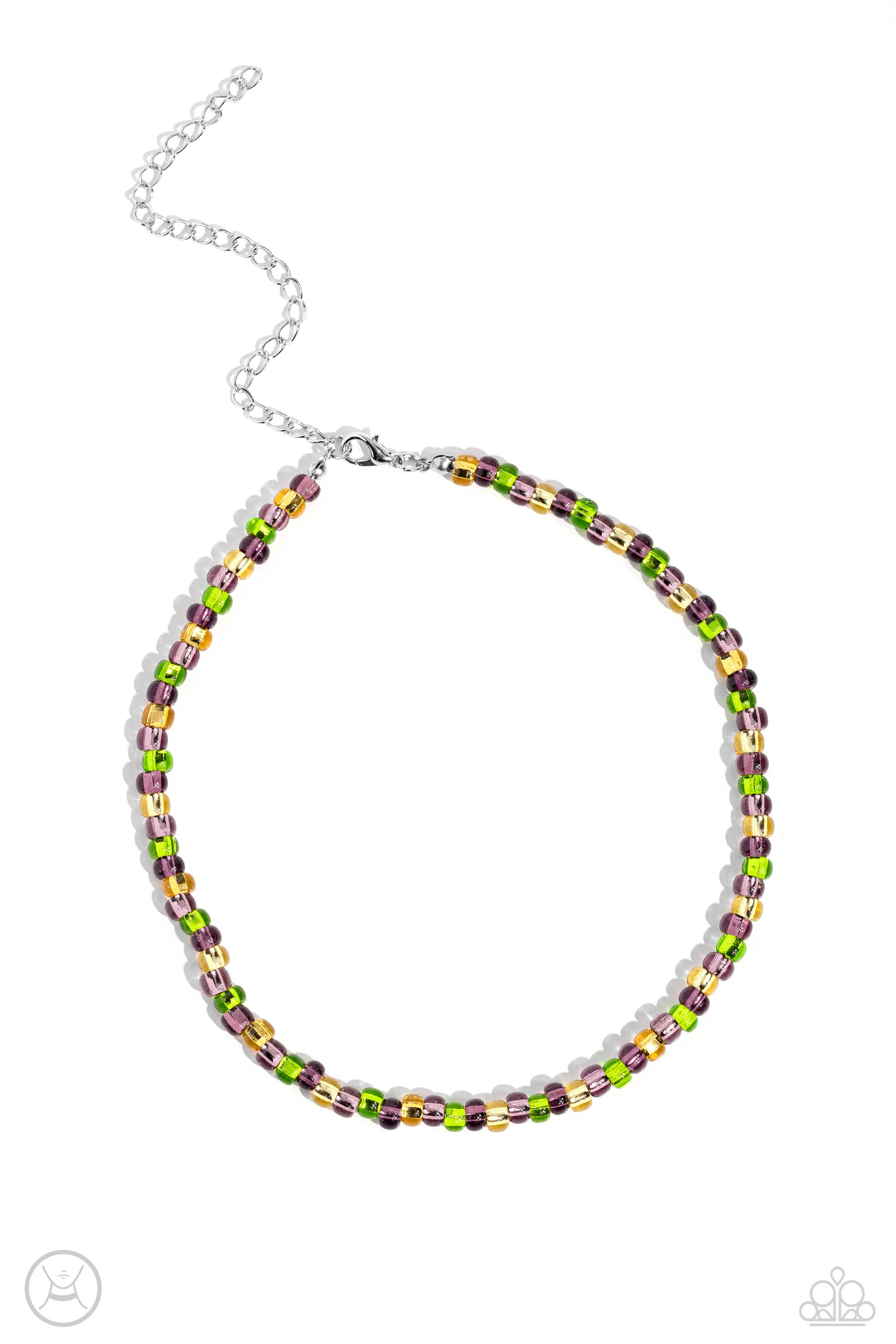 Stretched along an invisible wire, a collection of glassy plum, olive, lavender, and peach beads circles above the collar for a vibrant pop of color. Features an adjustable clasp closure.
