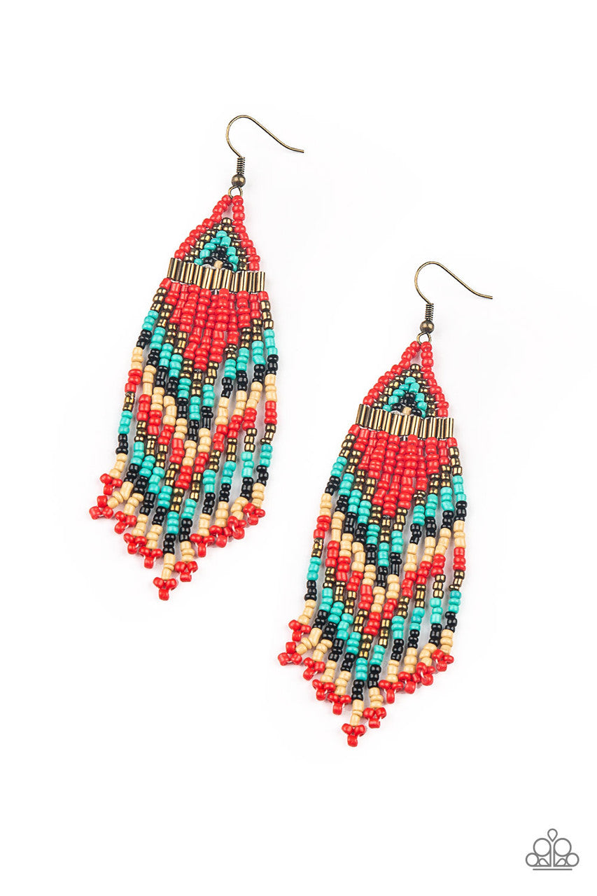 Infused with brassy metallic accents, black, blue, red, tan, and brass seed beads cascade from the ear in a vivacious beaded fringe. Earring attaches to a standard fishhook fitting.