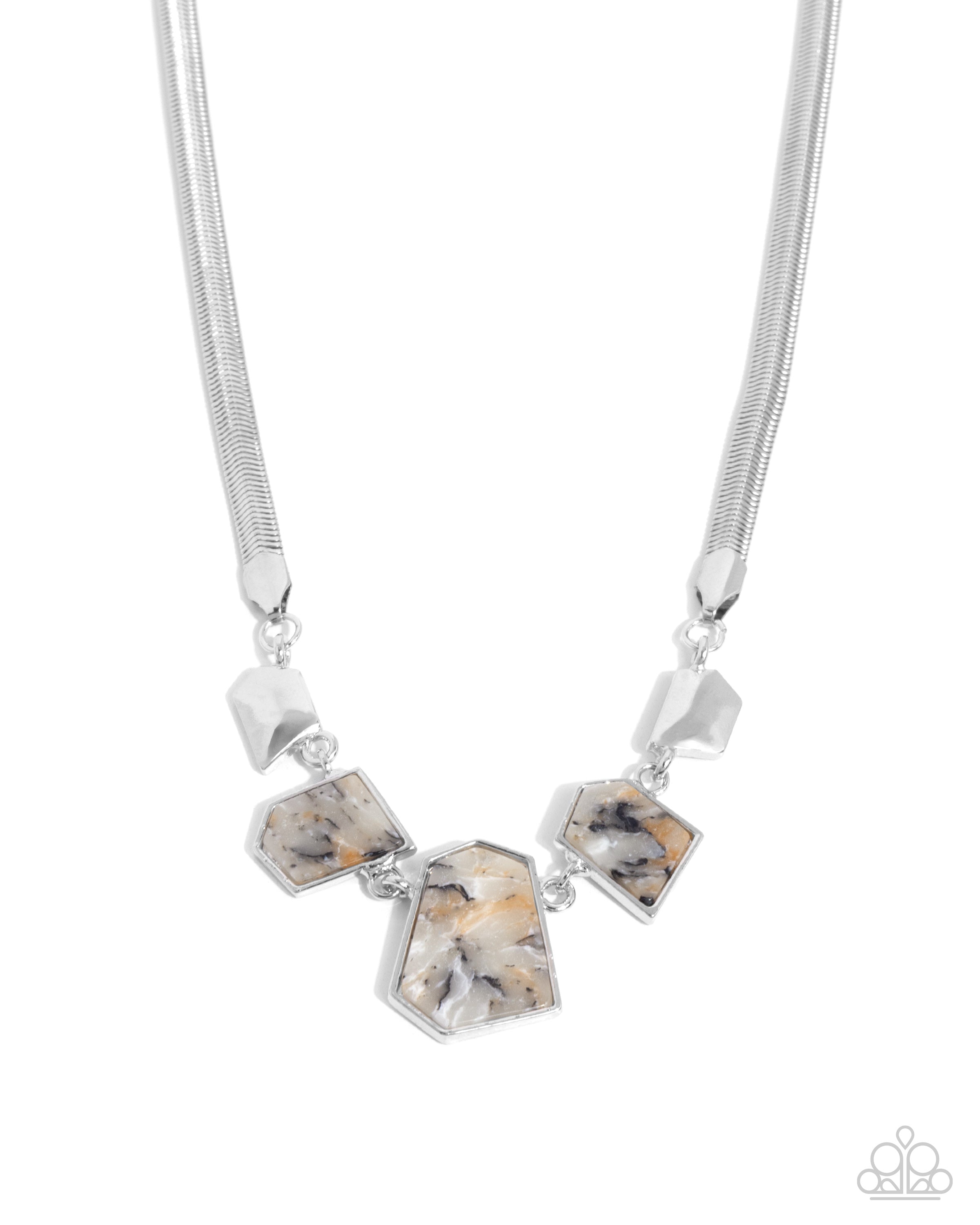 A collection of abstract silver pieces frames a trio of varying sizes of neutral abstract stones with a warm brown and black marbling from a glistening silver snake chain for a linear lawless look. Features an adjustable clasp closure. As the stone elements in this piece are natural, some color variation is normal.