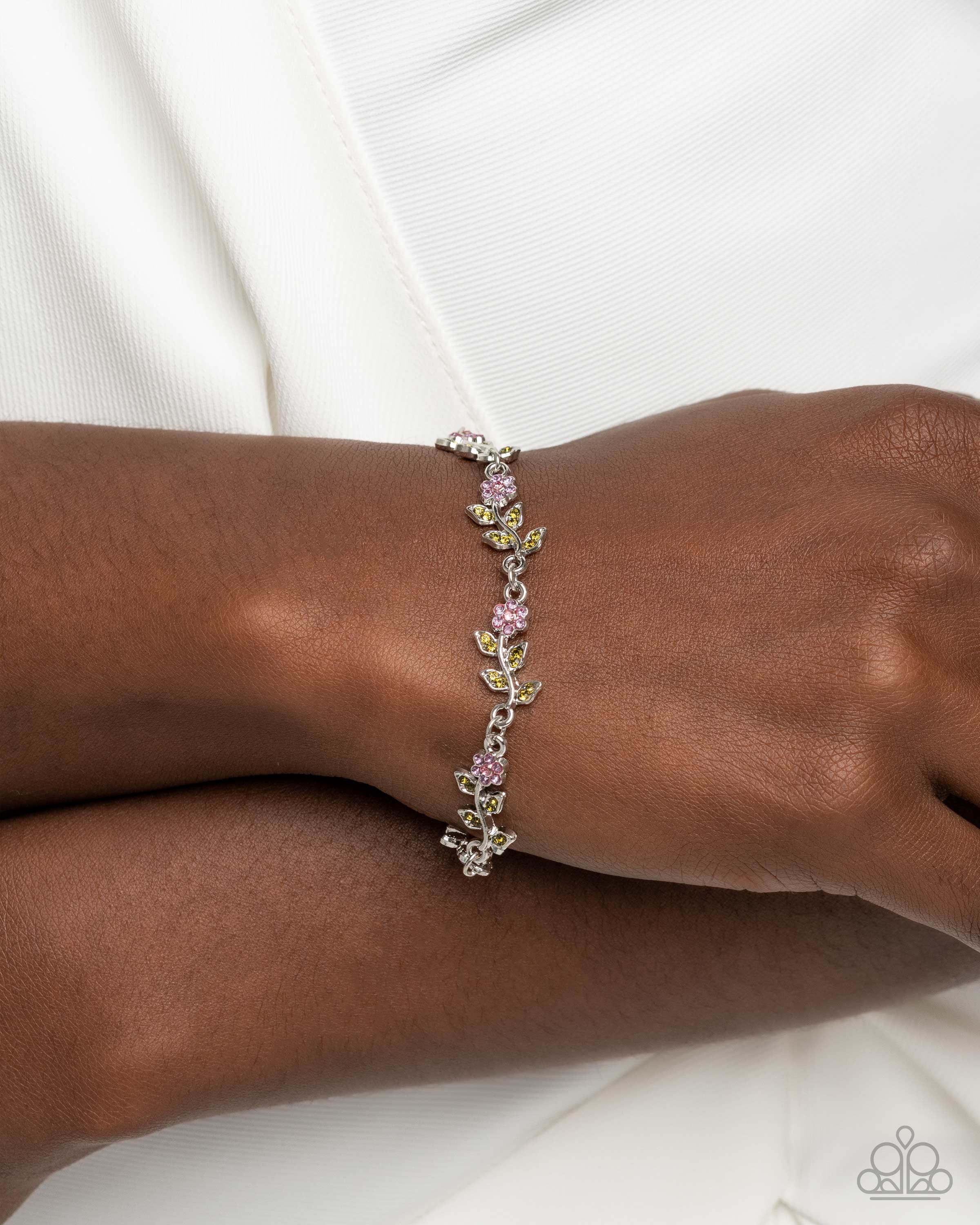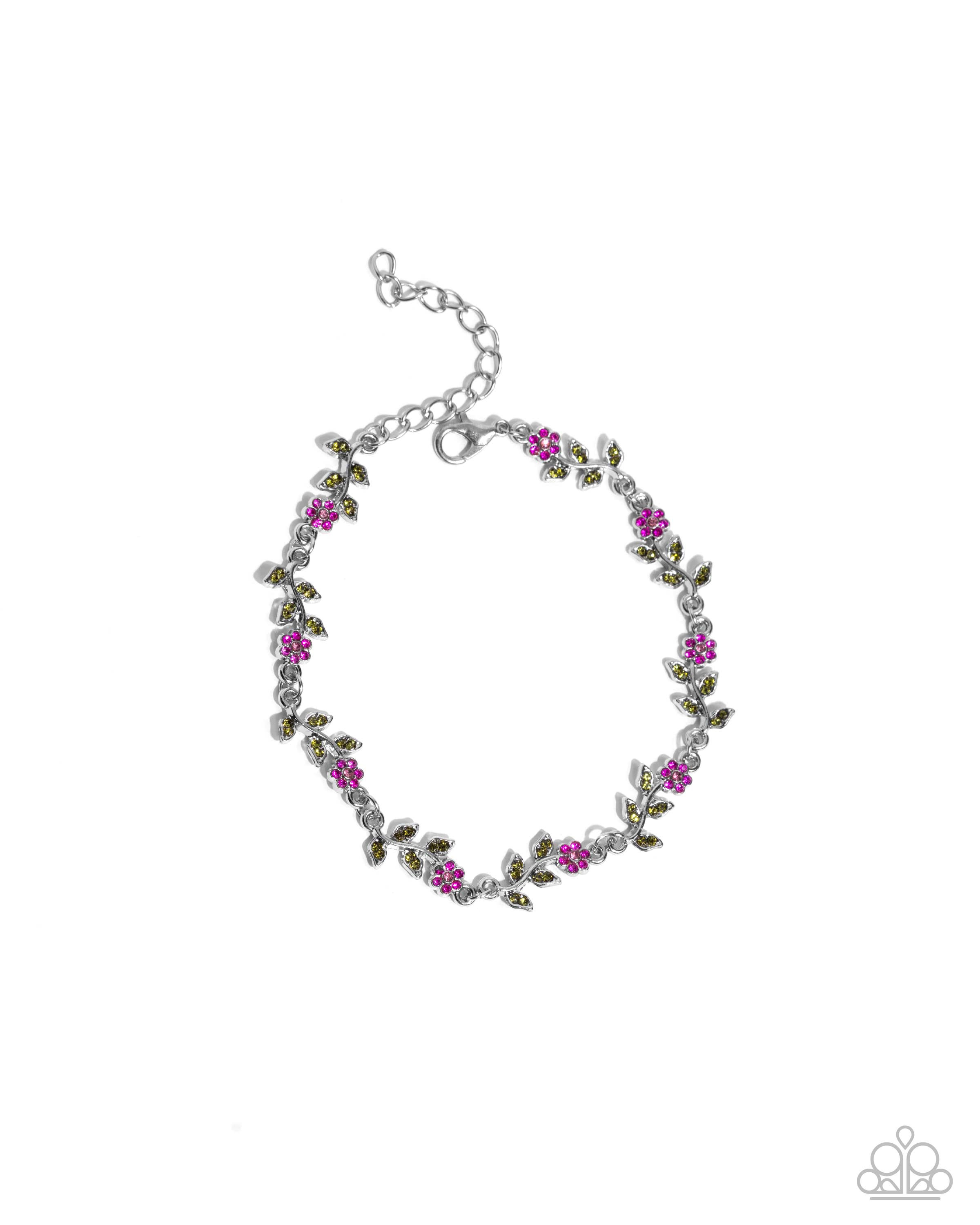 Dotted with dainty light rose rhinestone centers, fuchsia rhinestone-petaled silver flowers delicately link around the wrist for an ethereal fashion. Duos of dainty olive rhinestones dot the leaves for additional whimsical detail. Features an adjustable clasp closure.