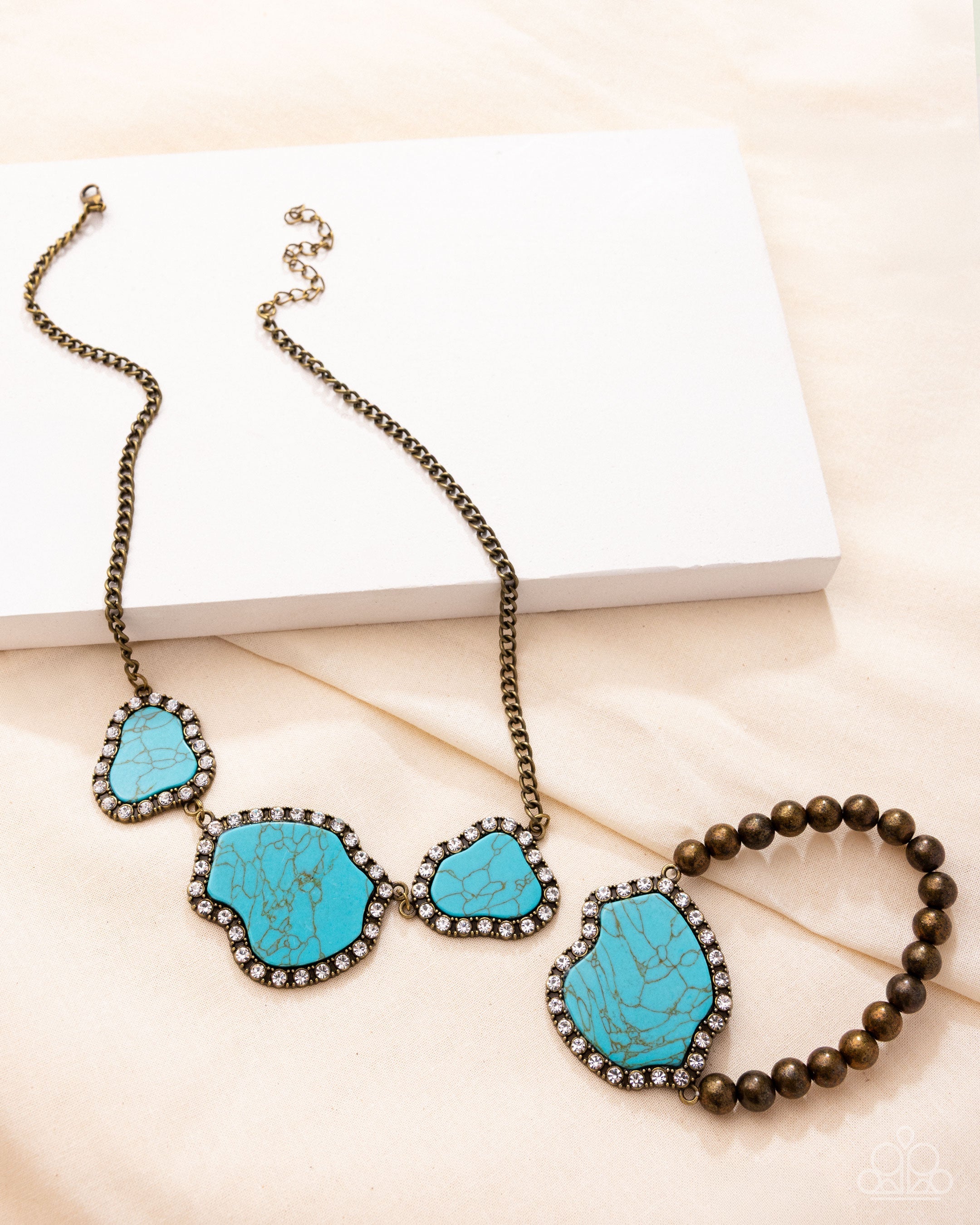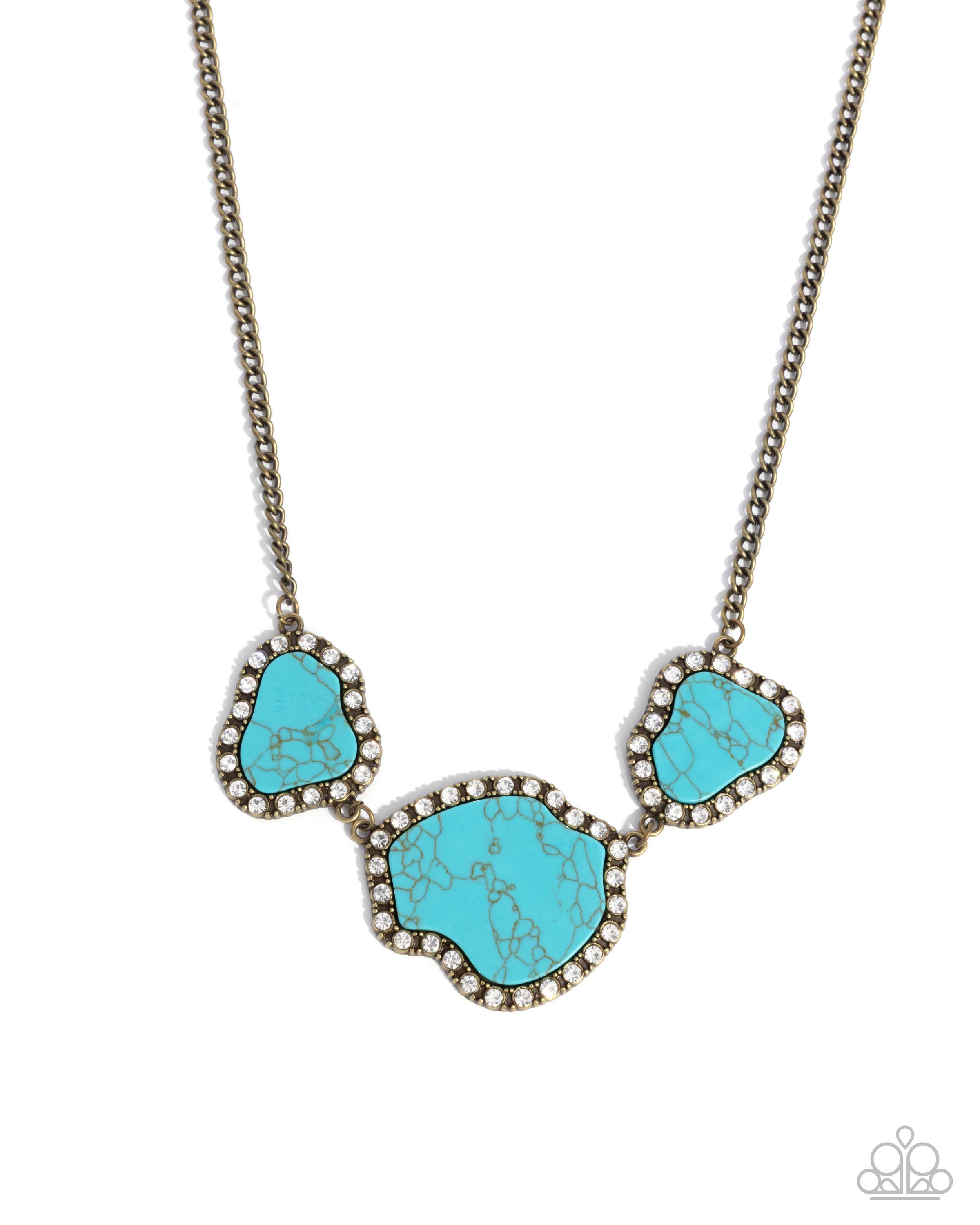 Set inside shimmery white rhinestone brass frames, flattened turquoise stones in abstract varying sizes create a startling pop of color against the neckline for an elegantly earthy finish. Features an adjustable clasp closure. As the stone elements in this piece are natural, some color variation is normal.