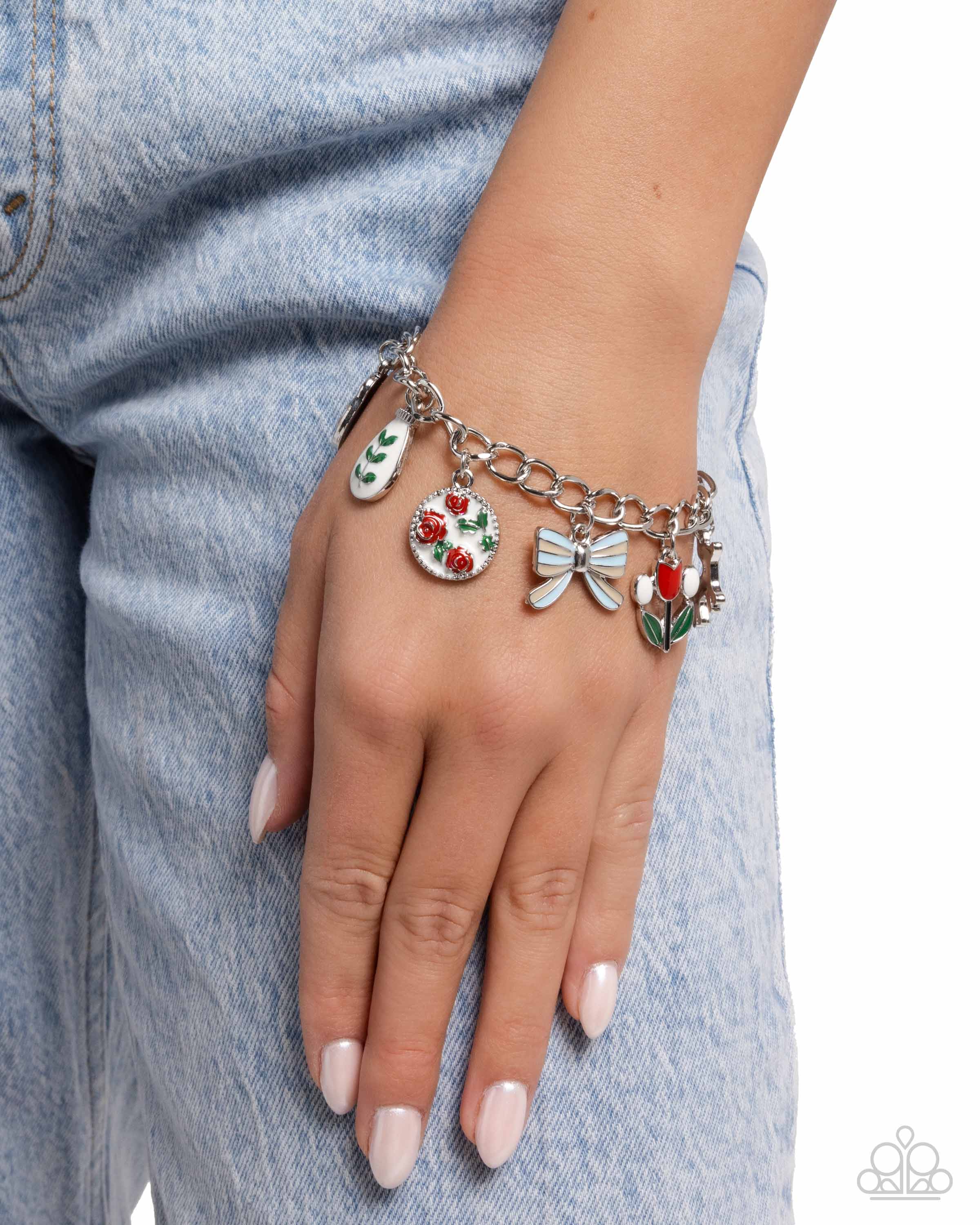 Swaying along a silver curb chain, a collection of refined and whimsical charms with elaborate multicolored painted detail including a fox, a tulip complete with buds and leaves, a bow, a rose-embellished disc, a leaf-embellished lantern, an owl, and a mushroom with dainty white spots coalesce around the wrist for an eye-catching display. Features an adjustable clasp closure.