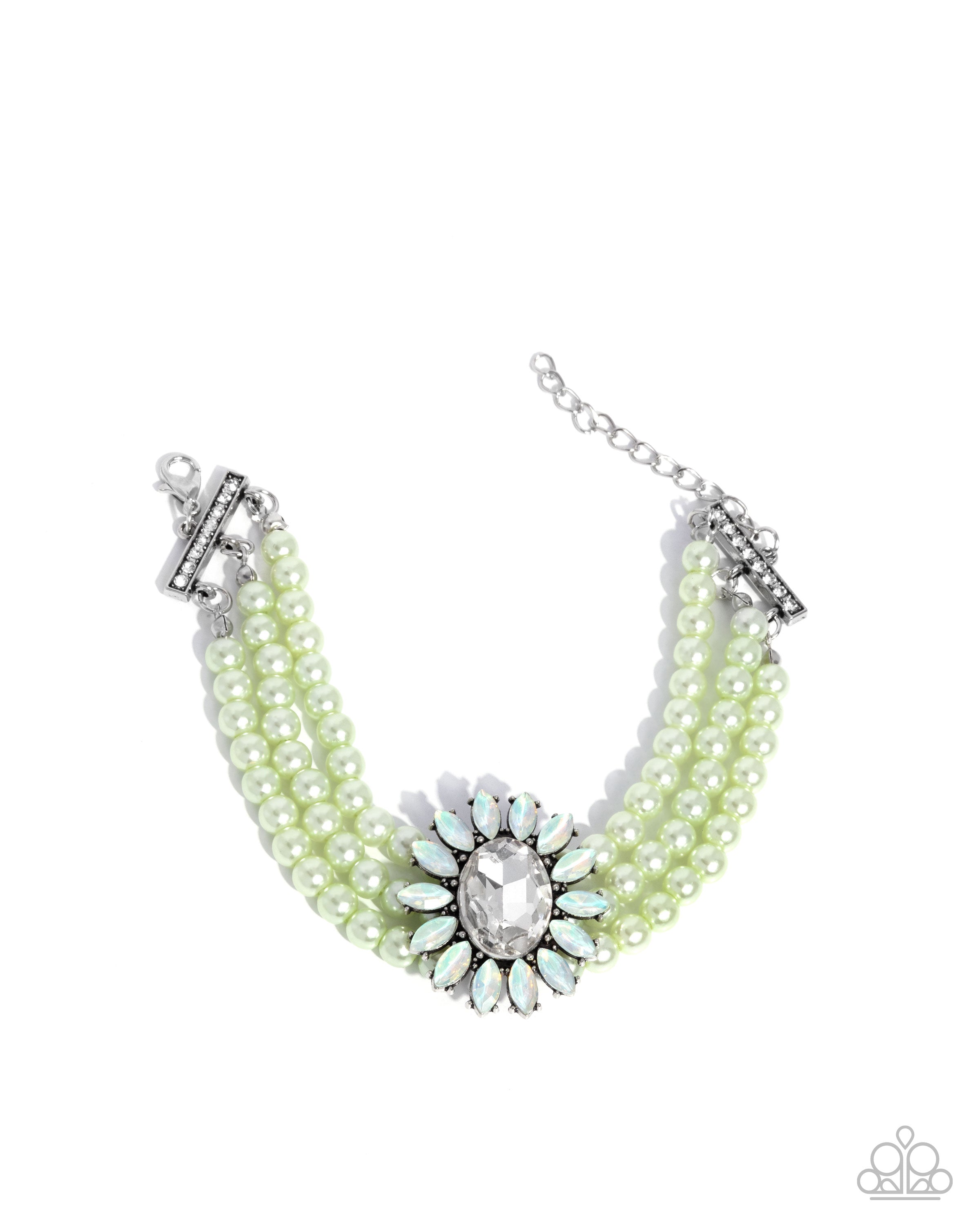 Pronged in silver fittings, an elegant explosion of marquise-cut green UV shimmery gem petals encircles a white oval gem delicately coalescing into a floral centerpiece. The refined ornament delicately holds together strands of glossy Lime Cream pearls that attach to silver horizontal fittings, creating romantically regal layers around the wrist. Features an adjustable clasp closure.