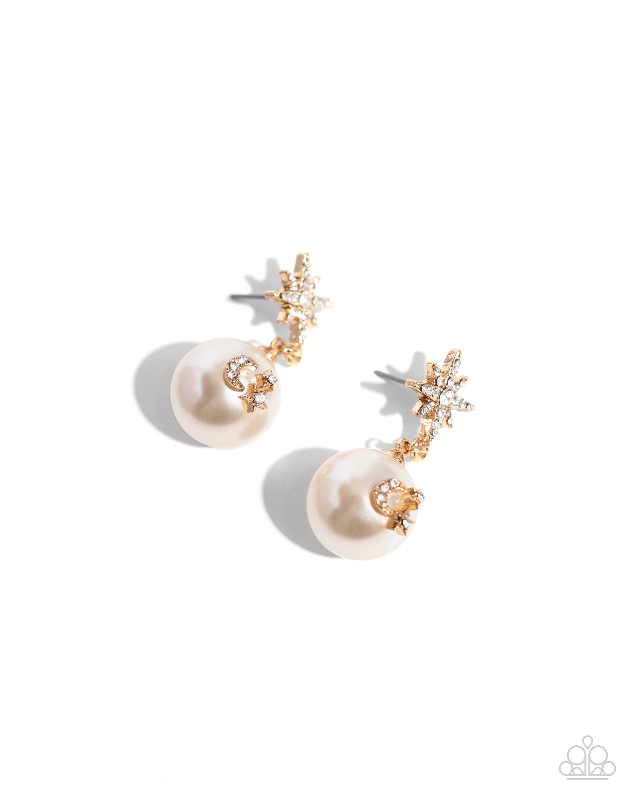 Embellished in glittery white rhinestones, a three-dimensional gold star gives way to an oversized glossy white pearl. Gracing the center of the pearl, a gold crescent moon and a duo of gold stars, also embellished with white rhinestones creates additional eye-catching stellar detail. Earring attaches to a standard post fitting.