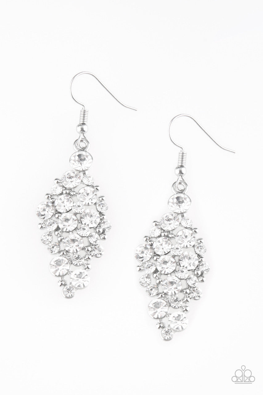 Varying in size, glittery white rhinestones and dainty silver studs coalesce into a sparkling diamond-shaped frame for a regal look. Earring attaches to a standard fishhook fitting.