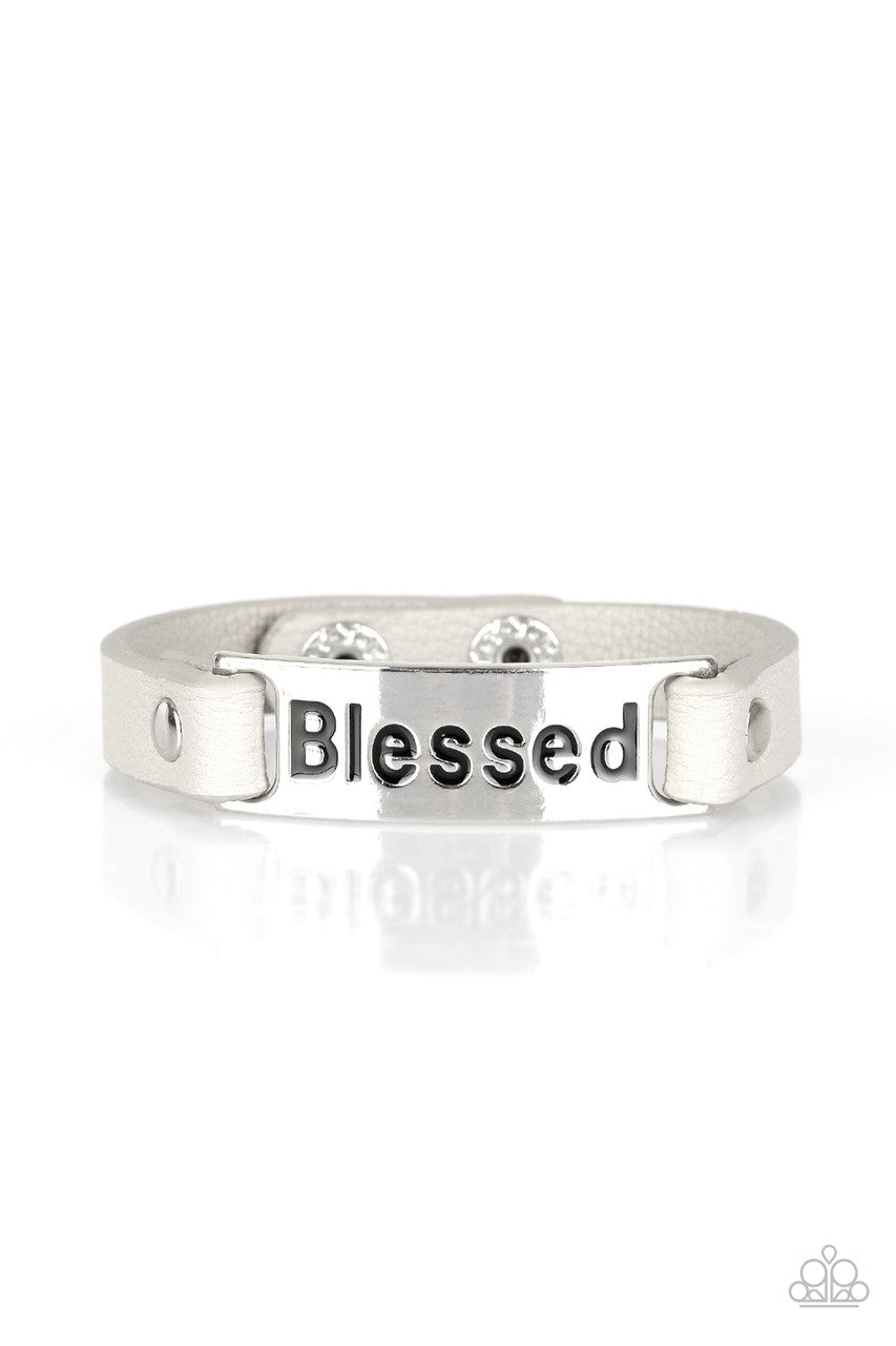 Stamped in the word, "Blessed", a shiny silver plate is studded in place along a dainty gray leather band for a whimsical look. Features an adjustable snap closure.