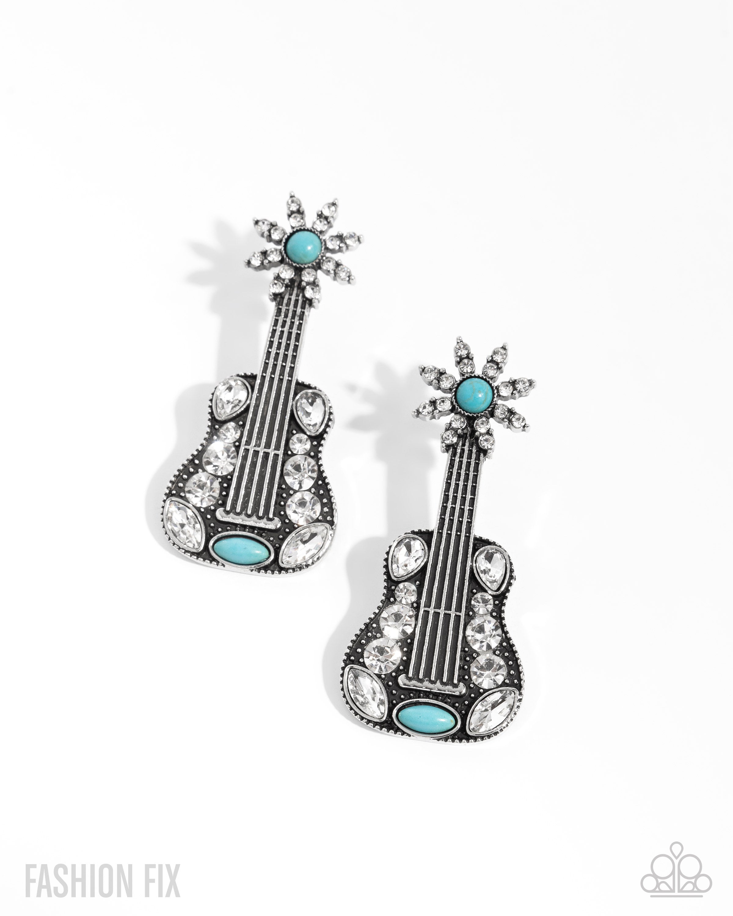 Detailed with marquise-cut, round, and teardrop white gems and turquoise stones, an ornate silver-studded guitar charismatically sways below the ear for a Western-inspired whimsical wonder. Earring attaches to a standard post fitting. As the stone elements in this piece are natural, some color variation is normal.