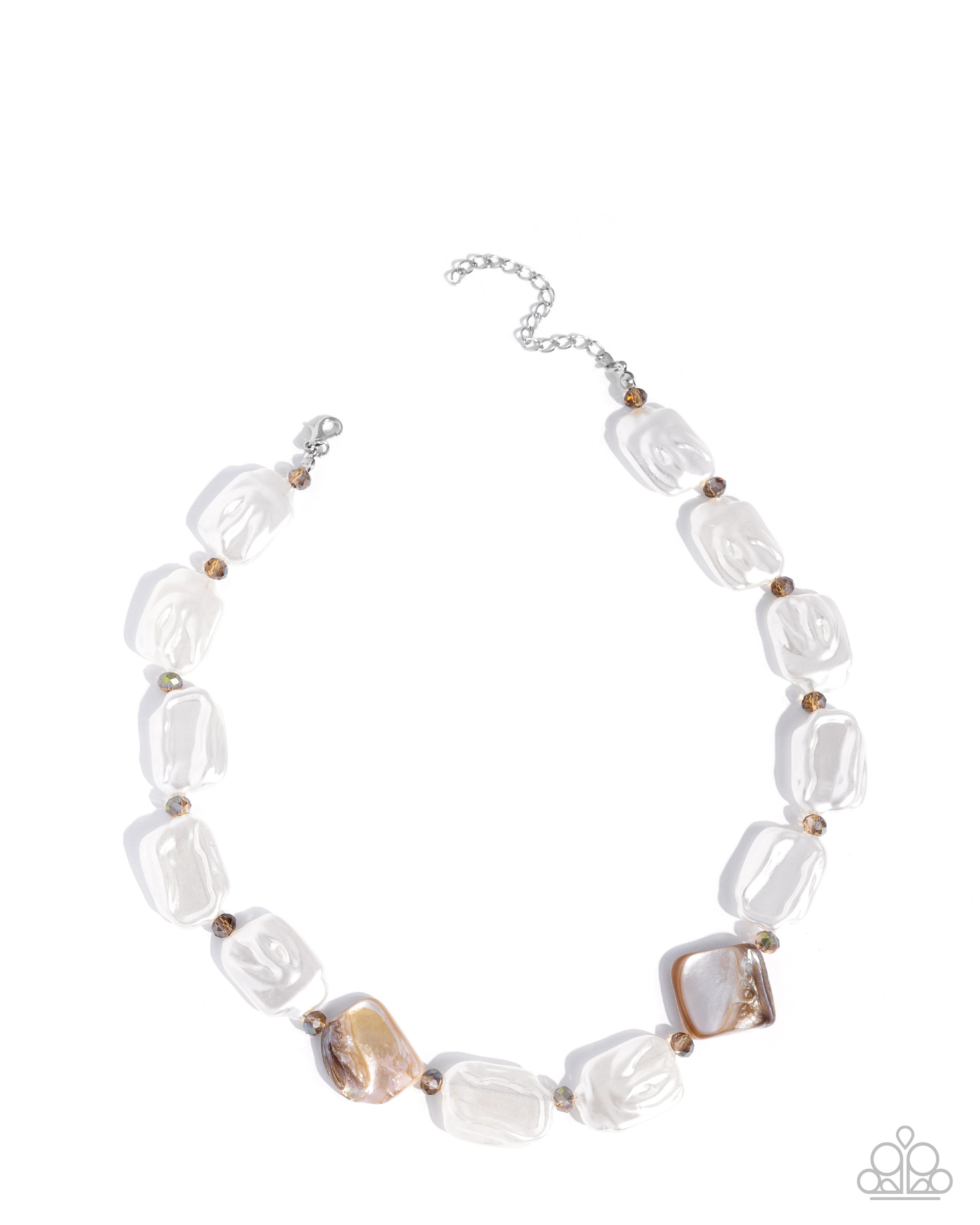 Lustrous white baroque pearls and brown shell-inspired beads alternate with faceted UV brown crystal accents, creating a sophisticated design. The asymmetrical shapes of the beads give the design a natural, elegant aesthetic. Features an adjustable clasp closure.