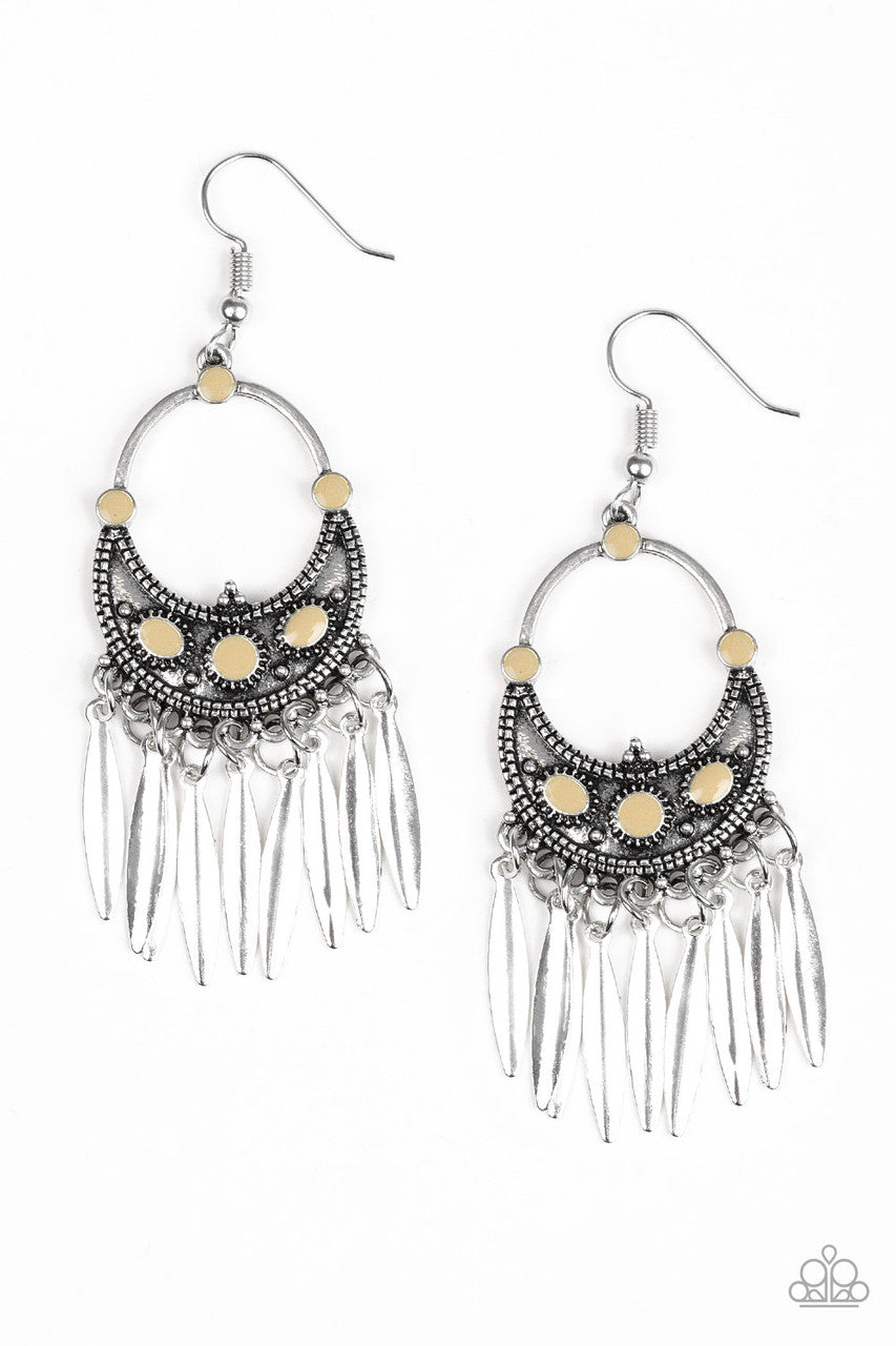 Painted in earthy Soybean accents, an ornate silver frame gives way to a fringe of flared silver bars for a whimsical look. Earring attaches to standard fishhook fitting.