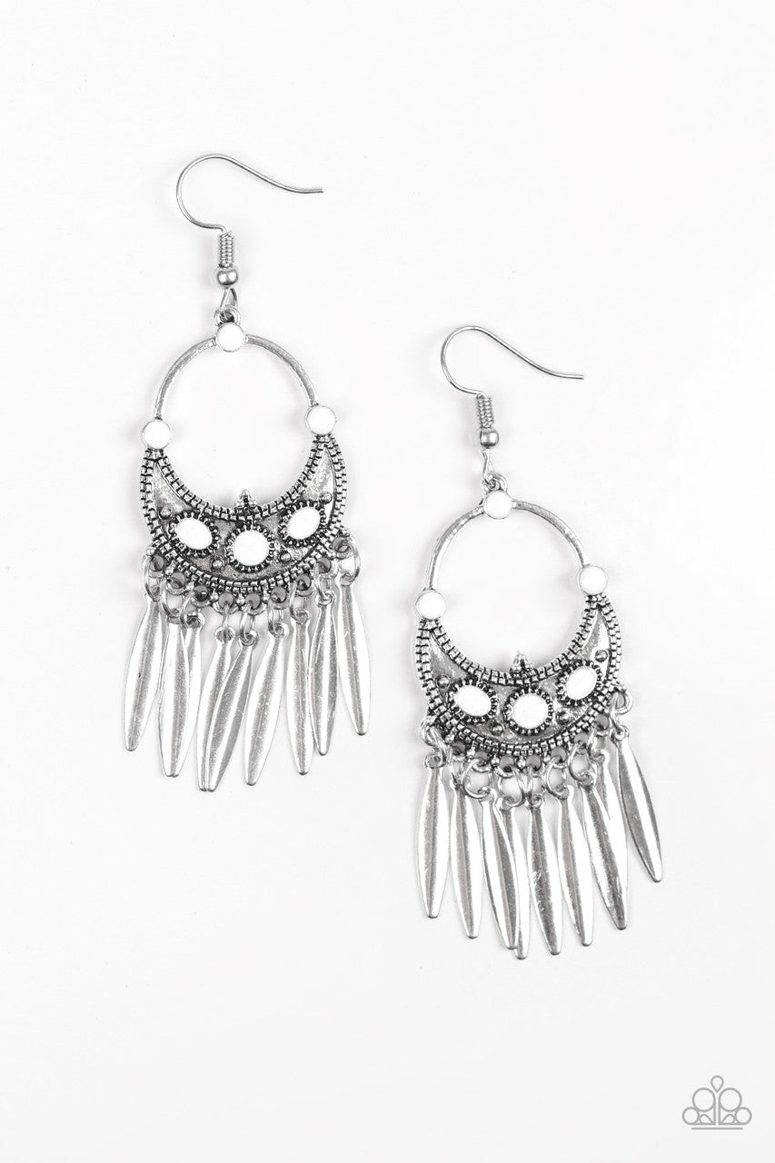 Painted in refreshing white accents, an ornate silver frame gives way to a fringe of flared silver bars for a whimsical look. Earring attaches to standard fishhook fitting.