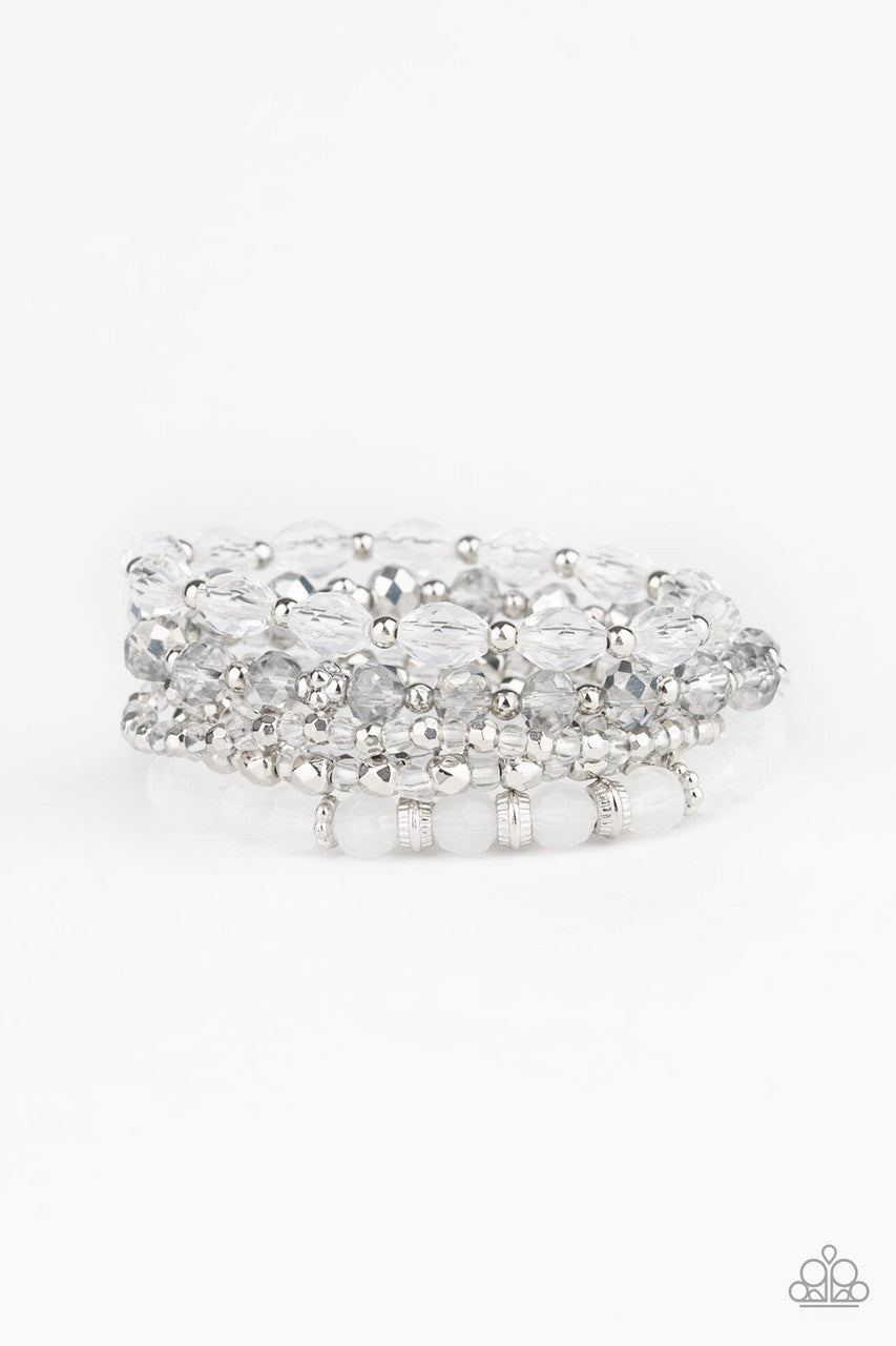 Infused with silver accents, a glassy collection of white and metallic crystal-like beads are threaded along stretchy bands around the wrist for a whimsically layered look.