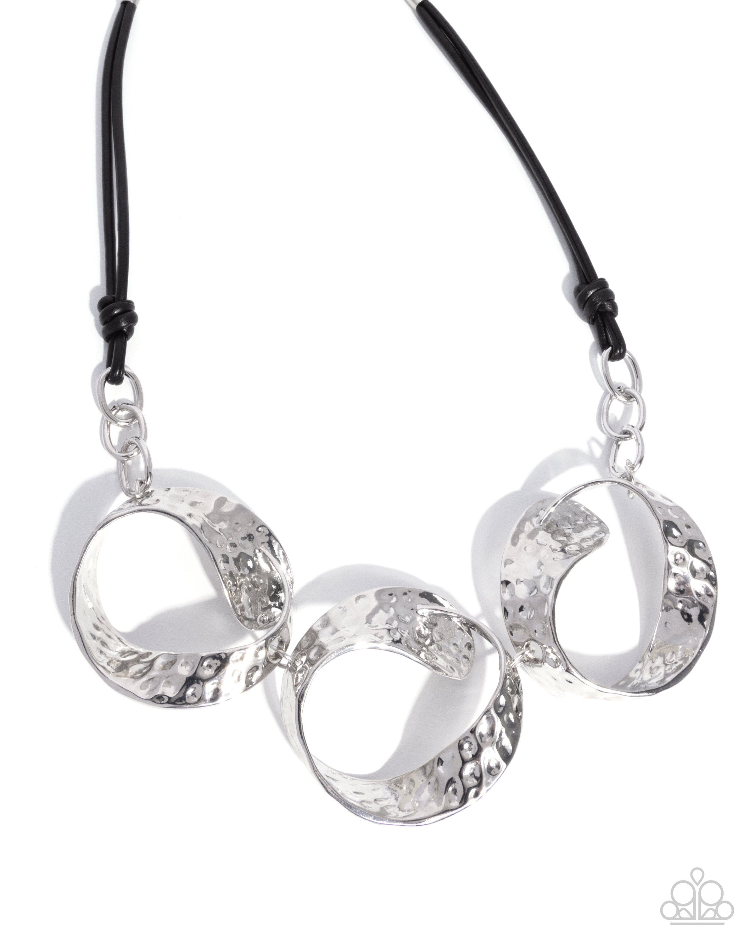 Hammered silver frames curl into chunky circles, connecting them as a trio with silver rings. The silver circles are suspended from black leather-like cords that provide a modern contrast to the metallic elements. Features an adjustable clasp closure.