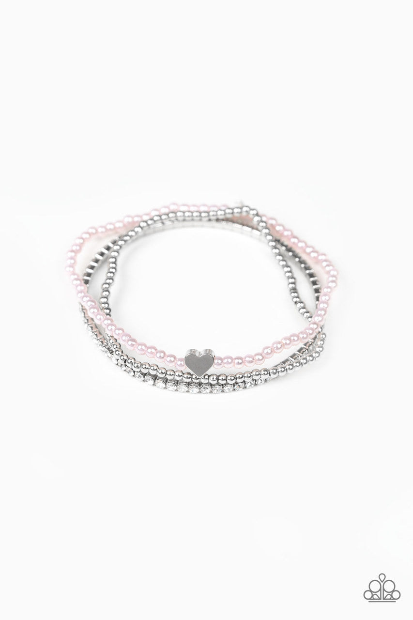 A collection of dainty silver beads, pearly pink beads, and glittery white rhinestone encrusted frames are threaded along stretchy bands around the wrist. A dainty silver heart charm is added to the pearly strand for a romantic finish.