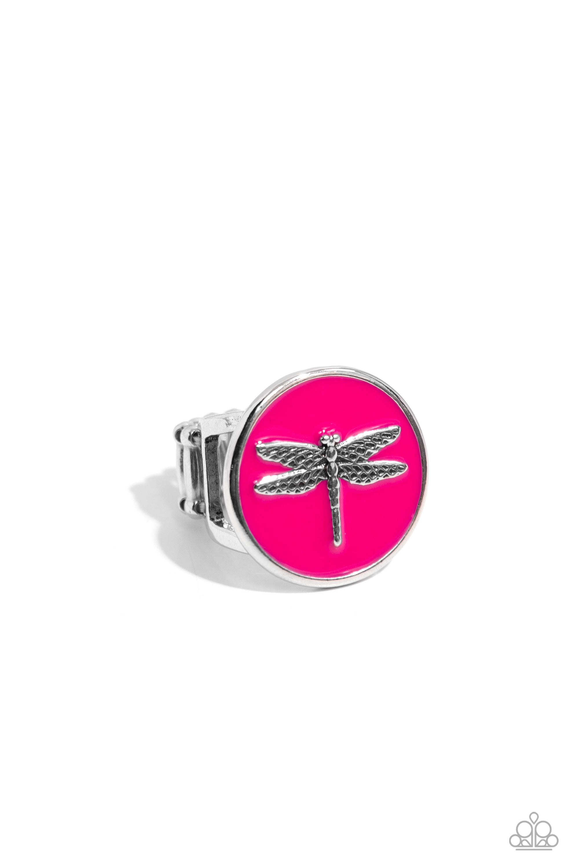 Centered amongst a Pink Peacock-painted disc, a silver dragonfly with textured wings flutters atop the finger for a colorfully, whimsical centerpiece. Features a stretchy band for a flexible fit.