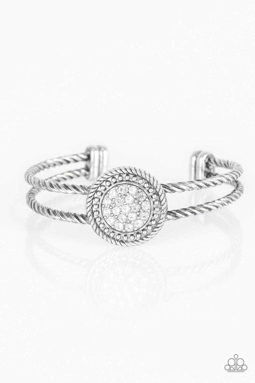 Brushed in an antiqued shimmer, twisted silver bars arc across the wrist, coalescing into an airy cuff. Radiating in silver studs and glittery white rhinestones, a round silver frame adorns the center for an edgy look.