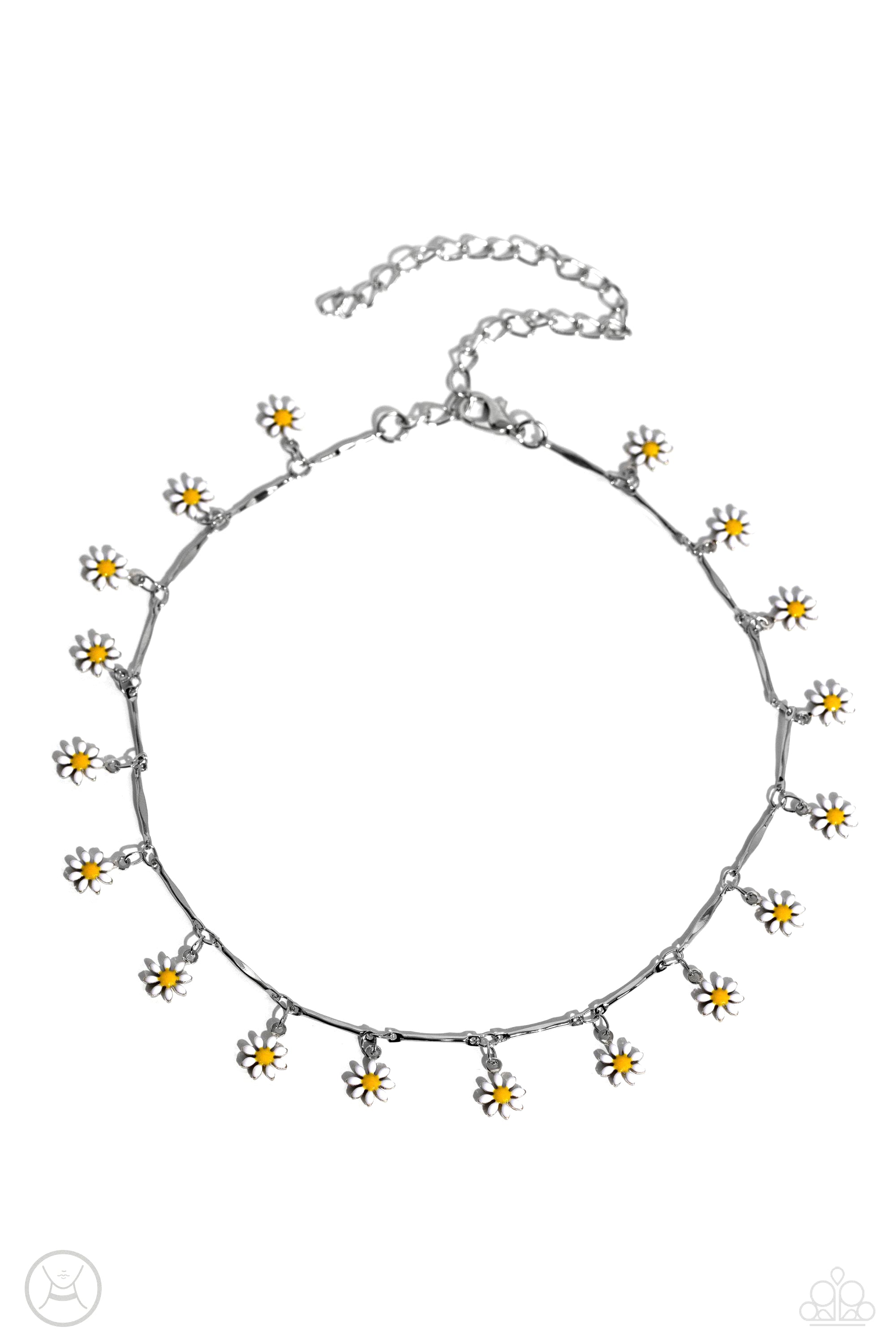 Featuring bright yellow centers, dainty white-petaled silver flowers drip between shiny silver bars along the collar, creating a dainty, floral fringe. Features an adjustable clasp closure.