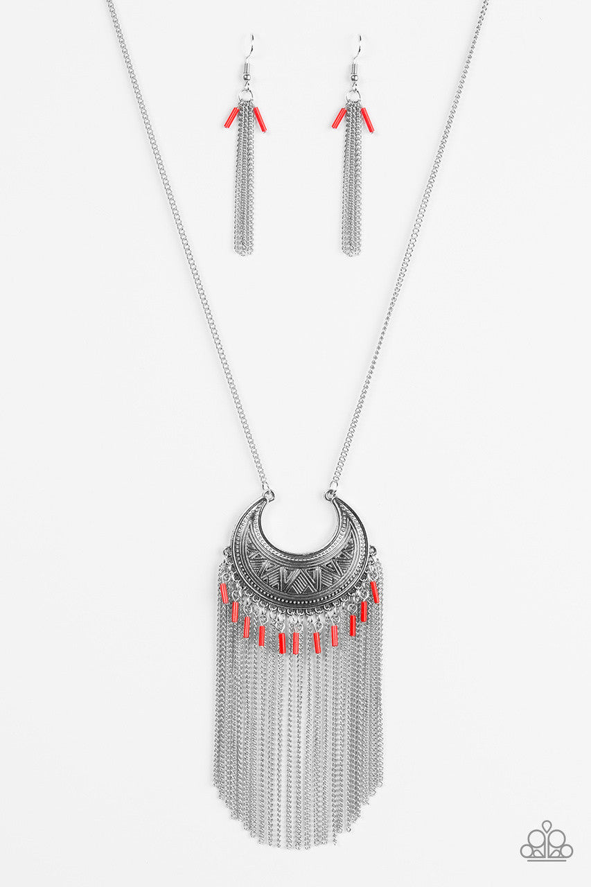 Etched in geometric patterns, a silver crescent swings from the bottom of an elongated silver chain. The tribal inspired pendant gives way to a shimmery fringe sprinkled with shiny red beads for a seasonal finish. Features an adjustable clasp closure.