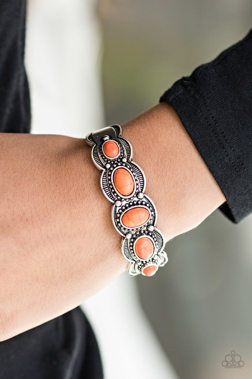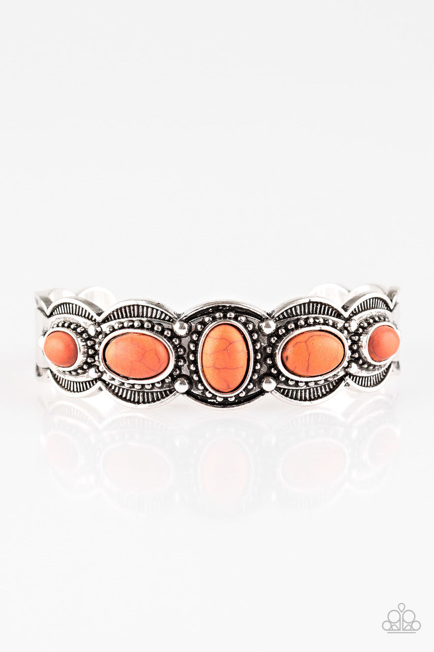 Vivacious orange stones are pressed down the center of a scalloped silver cuff radiating with studded textures for an artisan inspired look.