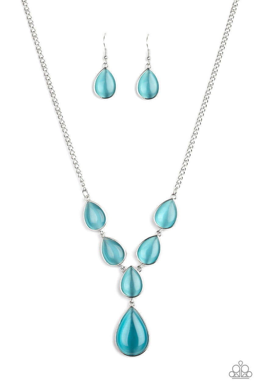 A series of blue cat's eye teardrops interlock at the bottom of a silver chain, giving way to an oversized teardrop pendant for a refined finish. Features an adjustable clasp closure.