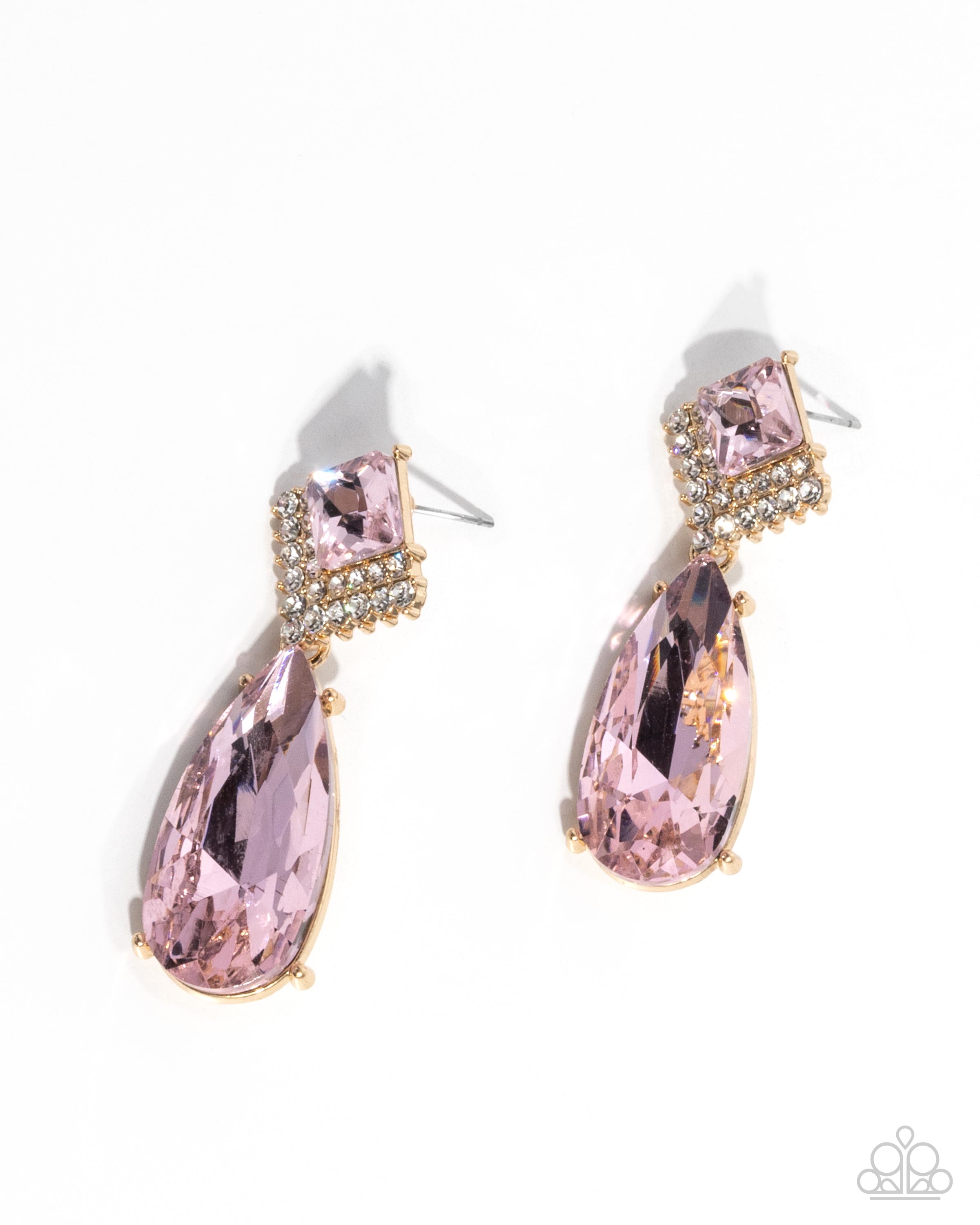 Pressed in round gold fittings, glittering rows of white rhinestones frame around a faceted pink tilted square gem giving way to an elongated pink teardrop gem, also pronged in gold fittings that reflects light with every sway for a pop of sophisticated color below the ear. Earring attaches to a standard post fitting.